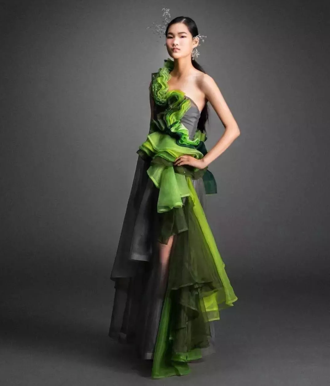 服装设计展区主题为:传·融,取传统戏曲服饰的传承与现代戏剧及当代服饰融合之意,传承与发扬,时间万事各种和合之美。从服装的纹饰、造型上可以看出这一组的风格,例如:奇妙的画家、诡异的僵尸、活泼的精灵等,有一组展览名为“林黛玉”,其纹饰做得精致小巧,颜色淡雅,融合了各类元素,充分表现了人物的性格特点。展厅中还有一处清新自然的“绿”,是毕业生陈静的毕业设计作品《童话丛林》。记者采访作者后了解到这份作品的灵感来源于岩层夹缝中的草。隐藏在石缝中的翠绿在自然层叠下轻轻呼吸,那抹与泥土芬芳缠绕的“绿”,奠定了丛林的基色,带有强烈军风的冷静大气,无论是闪耀金属色还是平淡无色的呼吸都是一次回忆之旅。