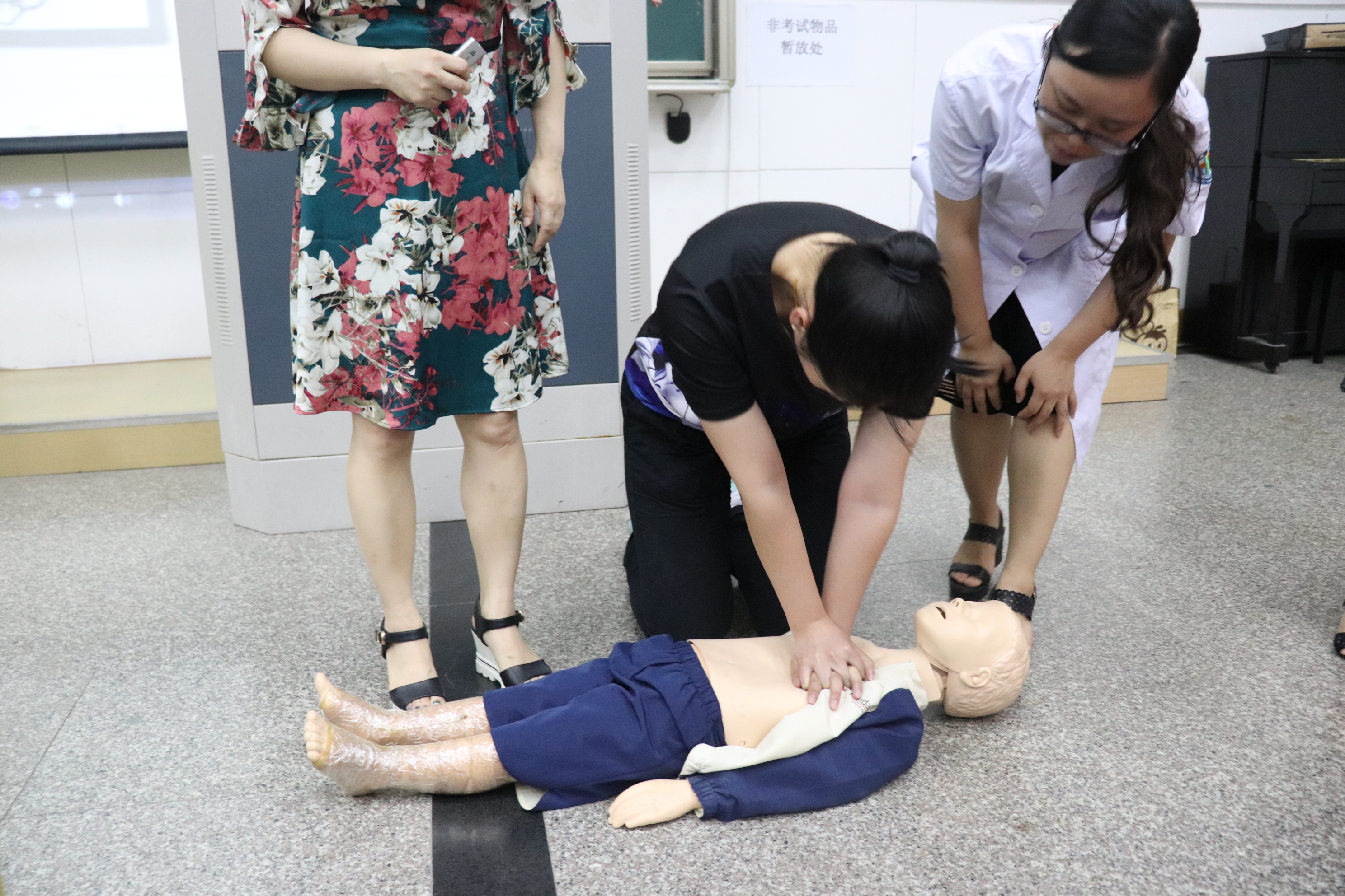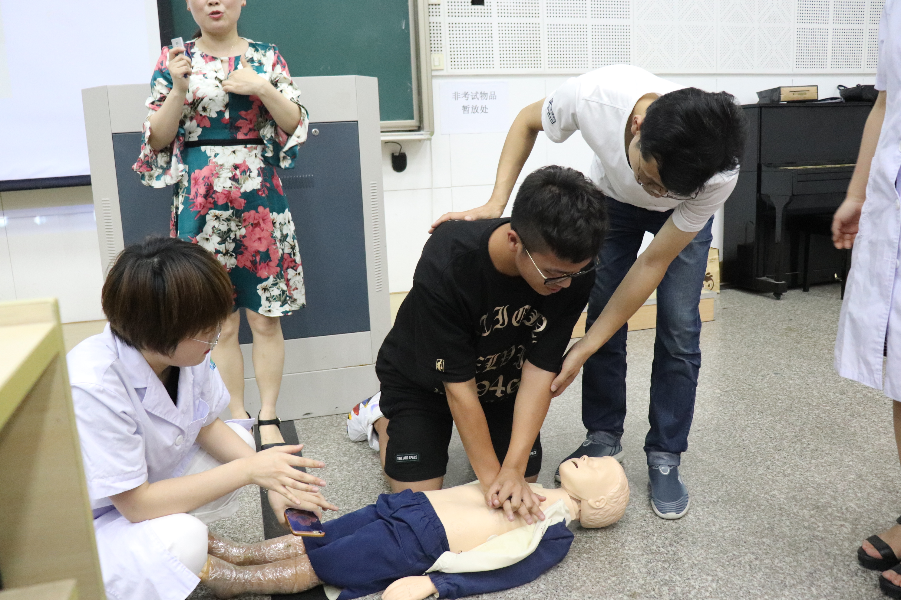 陈超以发生在校园内的一个个真实案例为切入点,介绍了遇到咽部受伤、咬(蛰)伤、惊厥,中暑、烧烫伤等突发情况时的急救方式,重点介绍了如何有效实施“心肺复苏”。陈超说,心搏骤停一旦发生,若得不到及时抢救复苏,4到6分钟后便会造成患者大脑和其他重要器官组织的不可逆损害,因而,心搏骤停后的心肺复苏必须在现场立即进行。现场,三位杭州儿童医院急诊科护士详细讲解并示范了心肺复苏的方法,同学们踊跃上场尝试,三位护士手把手地进行指导,矫正他们的错误姿势。