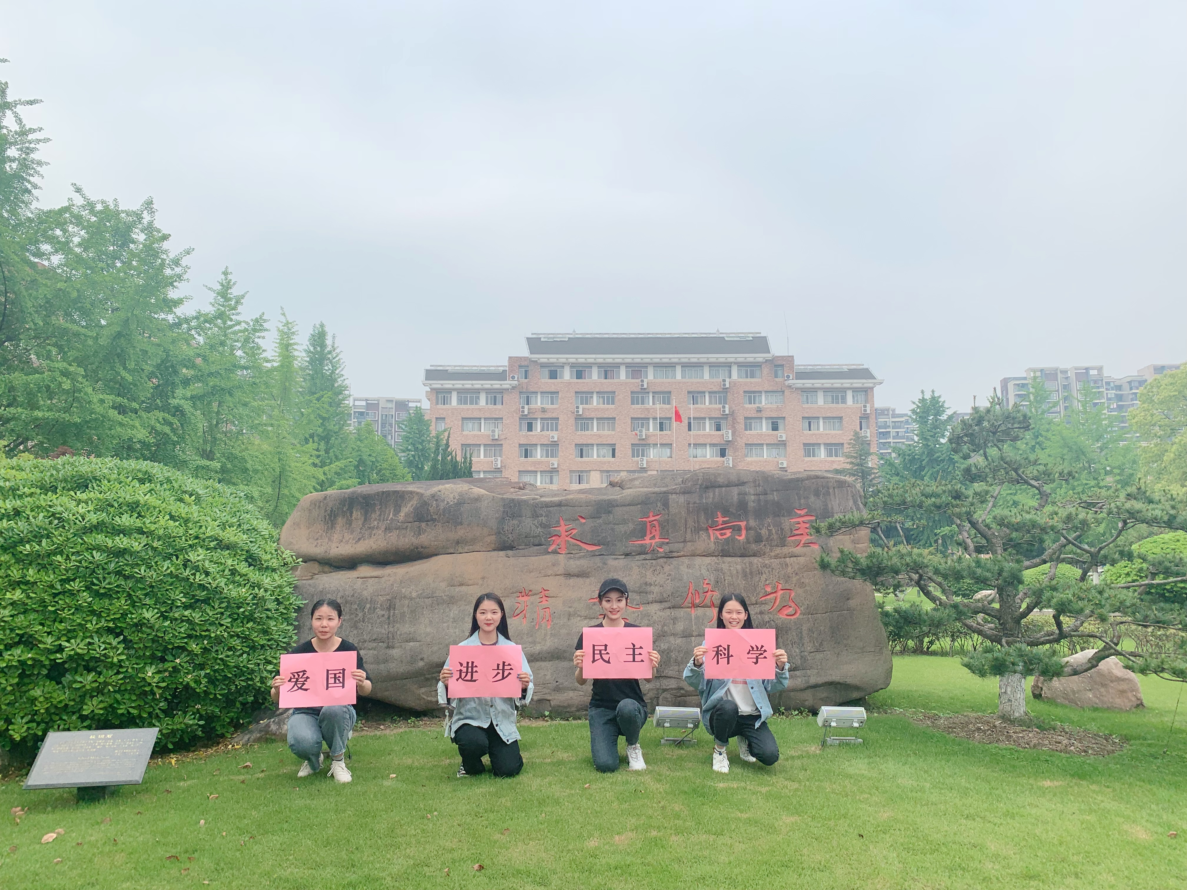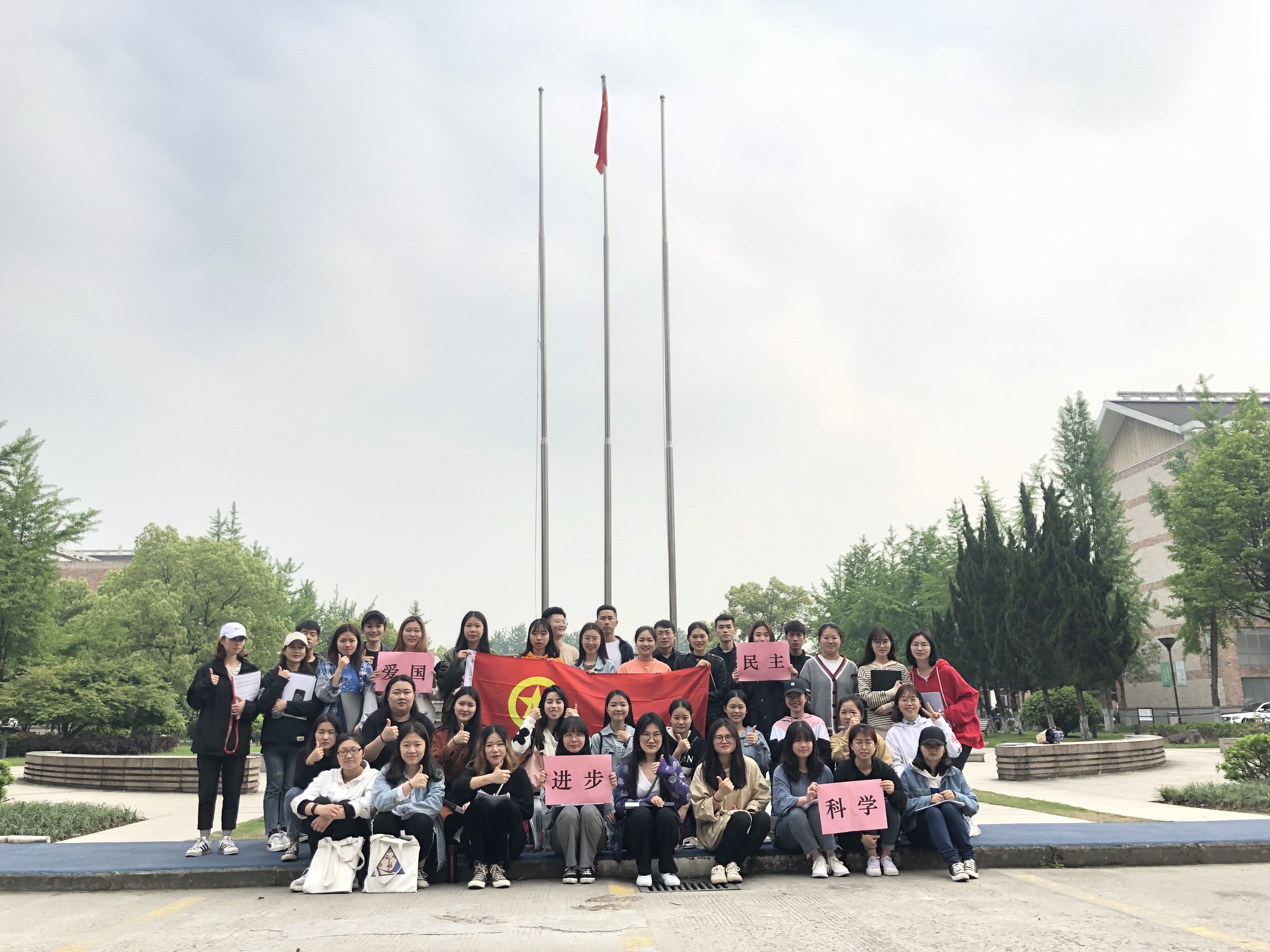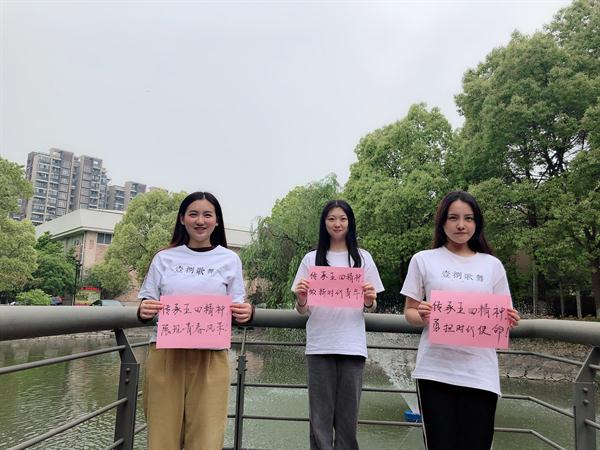 17声乐班、第33期音乐系党校学员班分别组织全体成员高举“爱国、进步、民主、科学”的五四精神,与国旗、团旗合影留念,在校训石旁留下印记,写下了“青春心向党 建功新时代”的坚定初心。