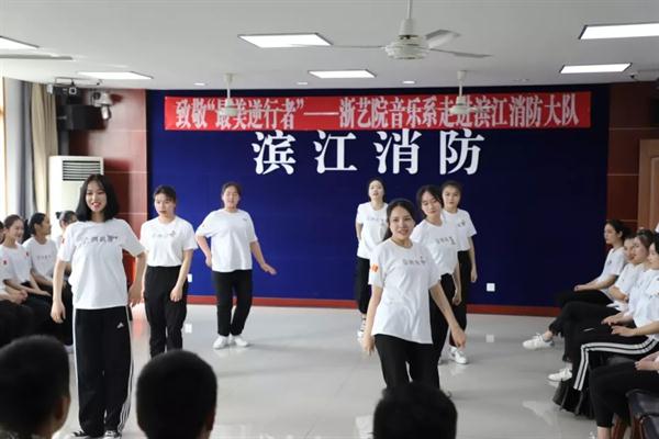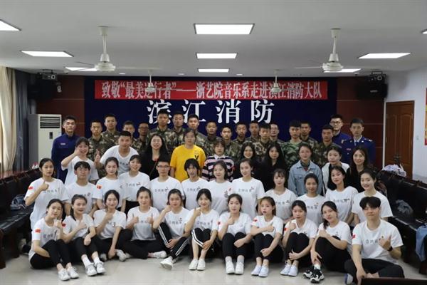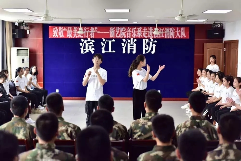 4月20日,浙江艺术职业学院音乐系师生组成文化志愿服务小分队走进杭州市消防支队滨江浦沿中队,为长期奋斗在灭火救援一线的消防指战员送上了一场名为“致敬‘最美逆行者’”的精彩演出。