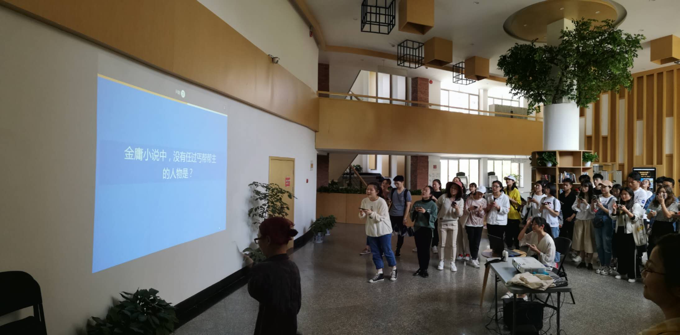4月18日中午,学校图信中心二楼大厅,100多名师生虎视眈眈盯着手机和大屏上投影的题目,打算争夺“头脑王者”称号。“头脑王者”百科知识互动竞答,是校图书馆在读书月推出的趣味活动,为了激发师生对各类知识的学习兴趣,拓展知识面,提高综合知识素养。