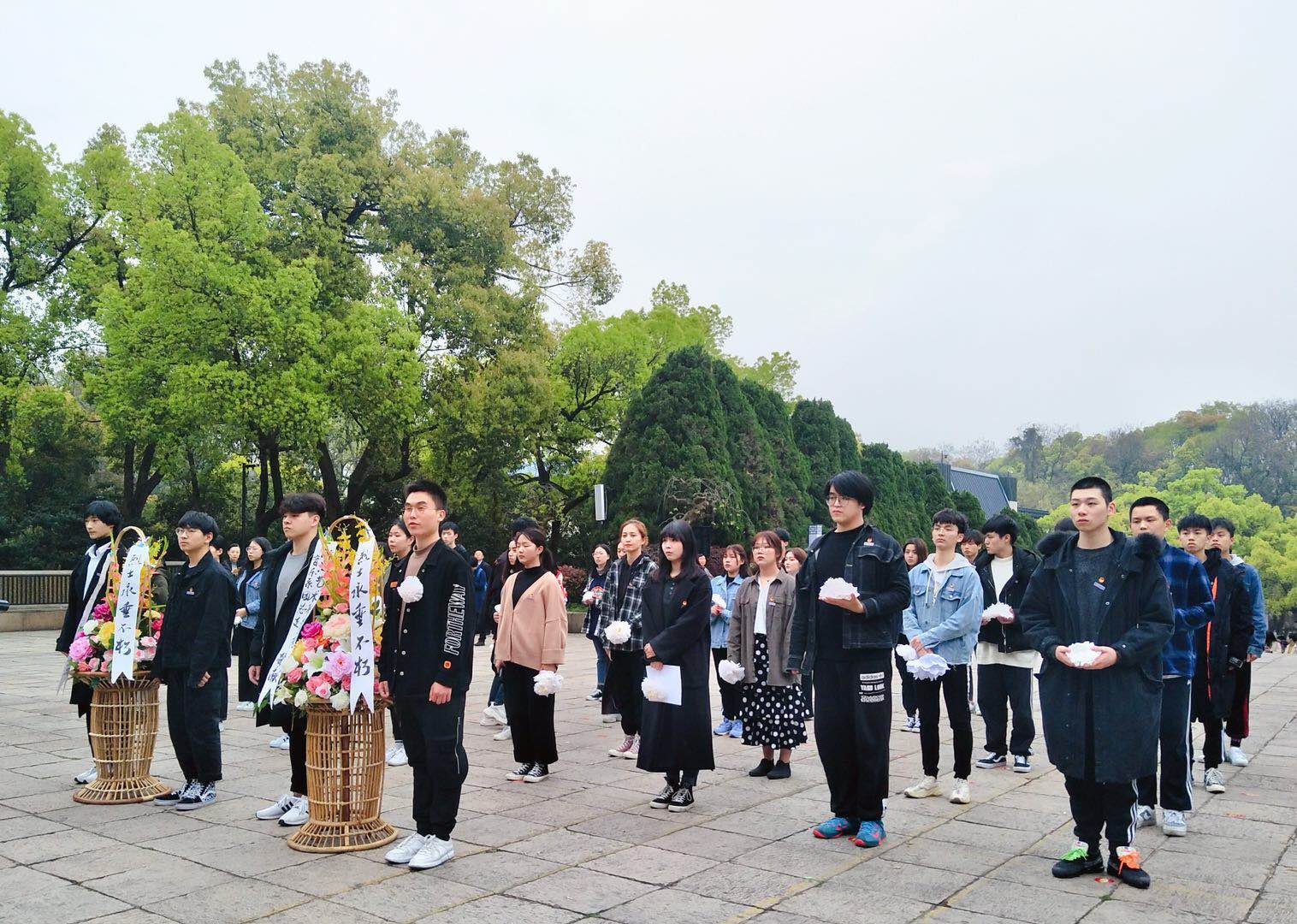 在烈士纪念碑前,师生们敬献花篮、齐唱国歌,向革命先烈庄重地三鞠躬。