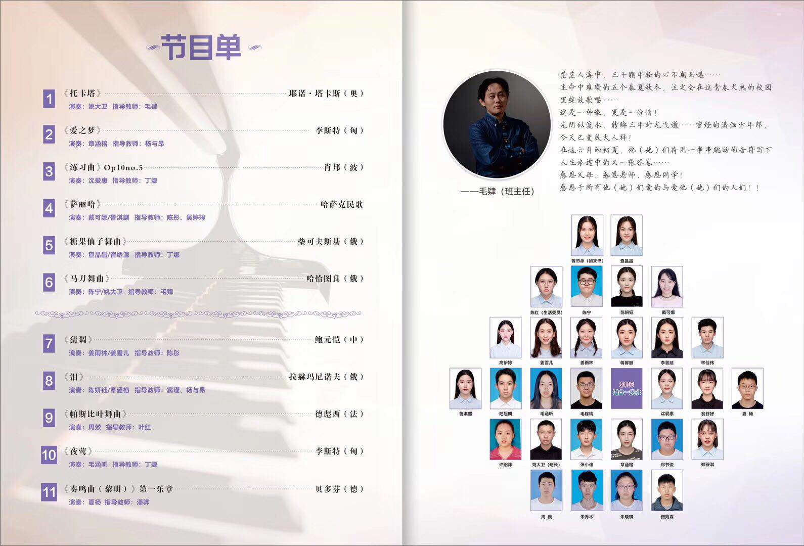 16键盘一贯班主任毛肄深情寄语班级学生茫茫人海中,三十颗年轻的心不期而遇。光阴似流水,转瞬三年时光飞逝……曾经的潇洒少年郎,今天已变成大人样!在这六月的初夏,你们将用一串串跳动的音符写下人生旅途中的又一份答卷……