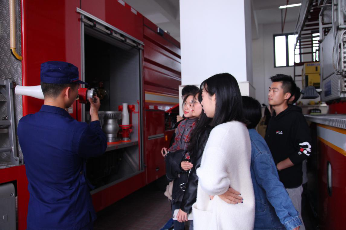 在中队消防战士的带领下,师生还一起参观了消防车,并与车上的消防器材“零距离”接触,聆听了战斗服、液压破拆组器材、无齿锯等消防器材的使用方法,收获满满。音乐系辅导员陈宏为长河中队送上锦旗,致以崇高的敬意。