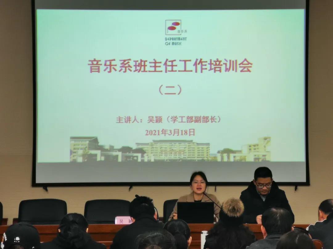 为贯彻落实立德树人根本任务,进一步规范班级学生管理,切实加强班主任队伍建设。318日,音乐系邀请校党委学工部副部长吴颖在13101报告厅作坚守有爱的教育 做有温度的班主任专题培训。音乐系党总支常务专职副书记谢志勇、全体辅导员、班主任参加。音乐系党总支专职副书记刘梦伟主持培训会。