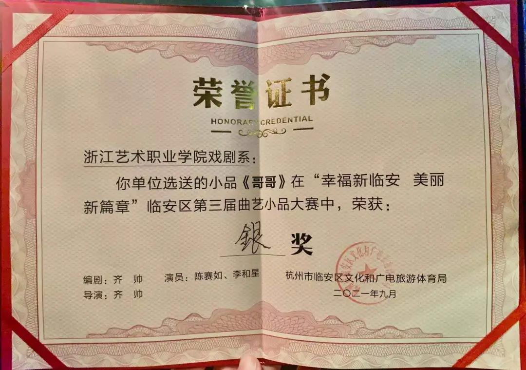 9月25日,由杭州市临安区文化和广电旅游体育局主办、杭州市临安区文化馆承办的临安区第三届曲艺小品大赛在临安剧院举行。戏剧系原创作品《哥哥》荣获临安区第三届曲艺小品大赛银奖。
