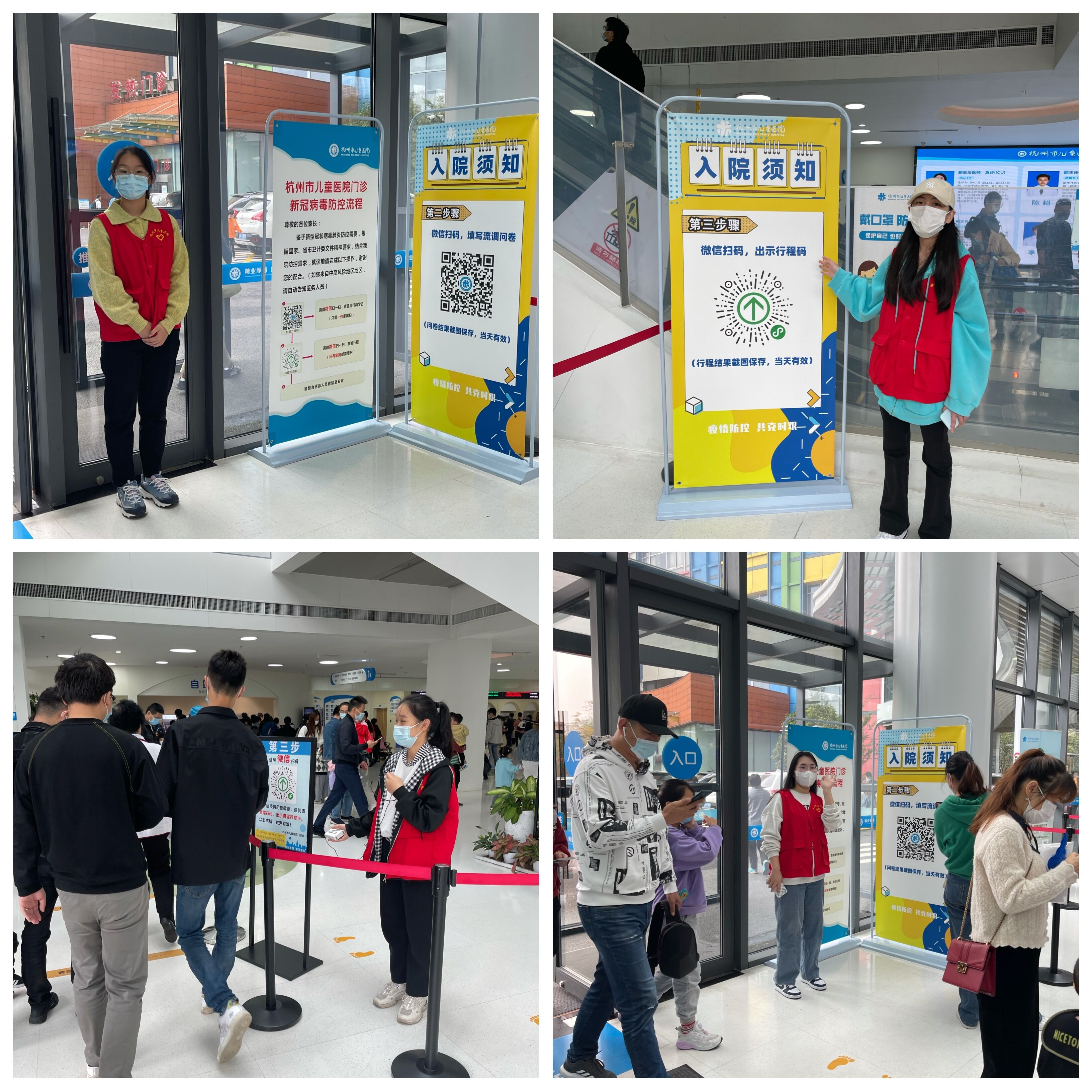 学生协助医院进行疫情防控就医引导,在门诊大楼入口处查验健康码、行程码,指导患儿家属填写疫情相关流行病学问卷调查,帮助医院减轻疫情防控工作压力。