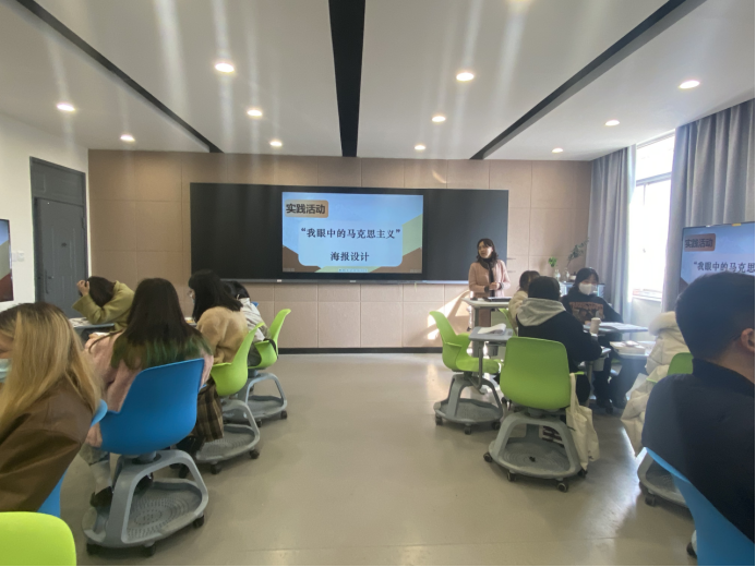 12月6日下午,社会科学部副主任、《马克思主义基本原理》课程主讲教师胡卓群8707智慧教室开展“我眼中的马克思主义”海报设计》实践教学活动课,课上邀请到美术系广告设计专业带头人、视觉传达设计专升本班班主任叶峰泉副教授作专业点评,美术系2021级视觉传达设计专升本班39名同学进行原创海报设计作品展示