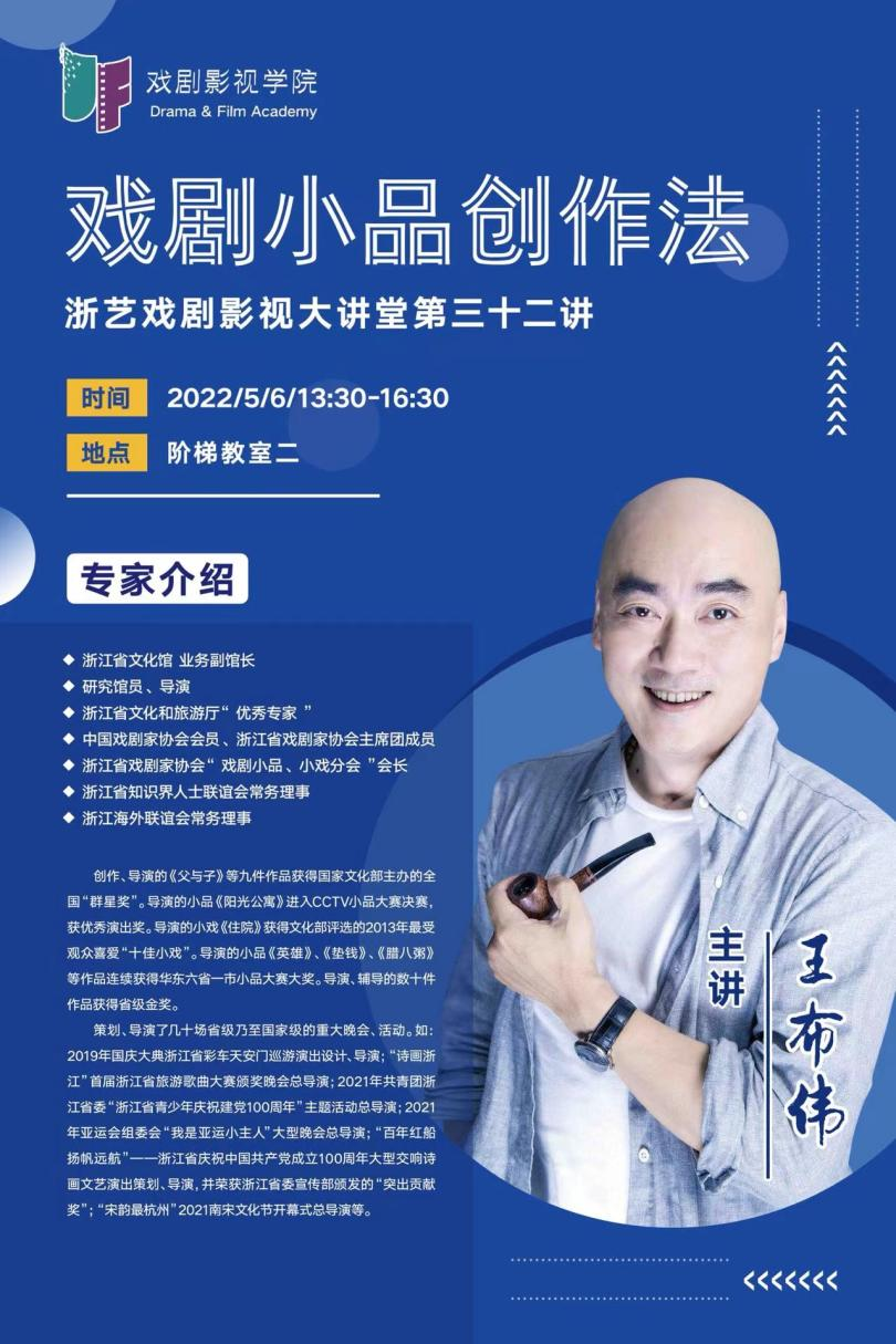 5月6日下午,浙艺戏剧影视大讲堂再度开课。本次大讲堂由浙江省文化馆副馆长王布伟为戏剧影视学院师生带来一场题为《“小而有品”——浅谈小品创作》的精彩讲座。