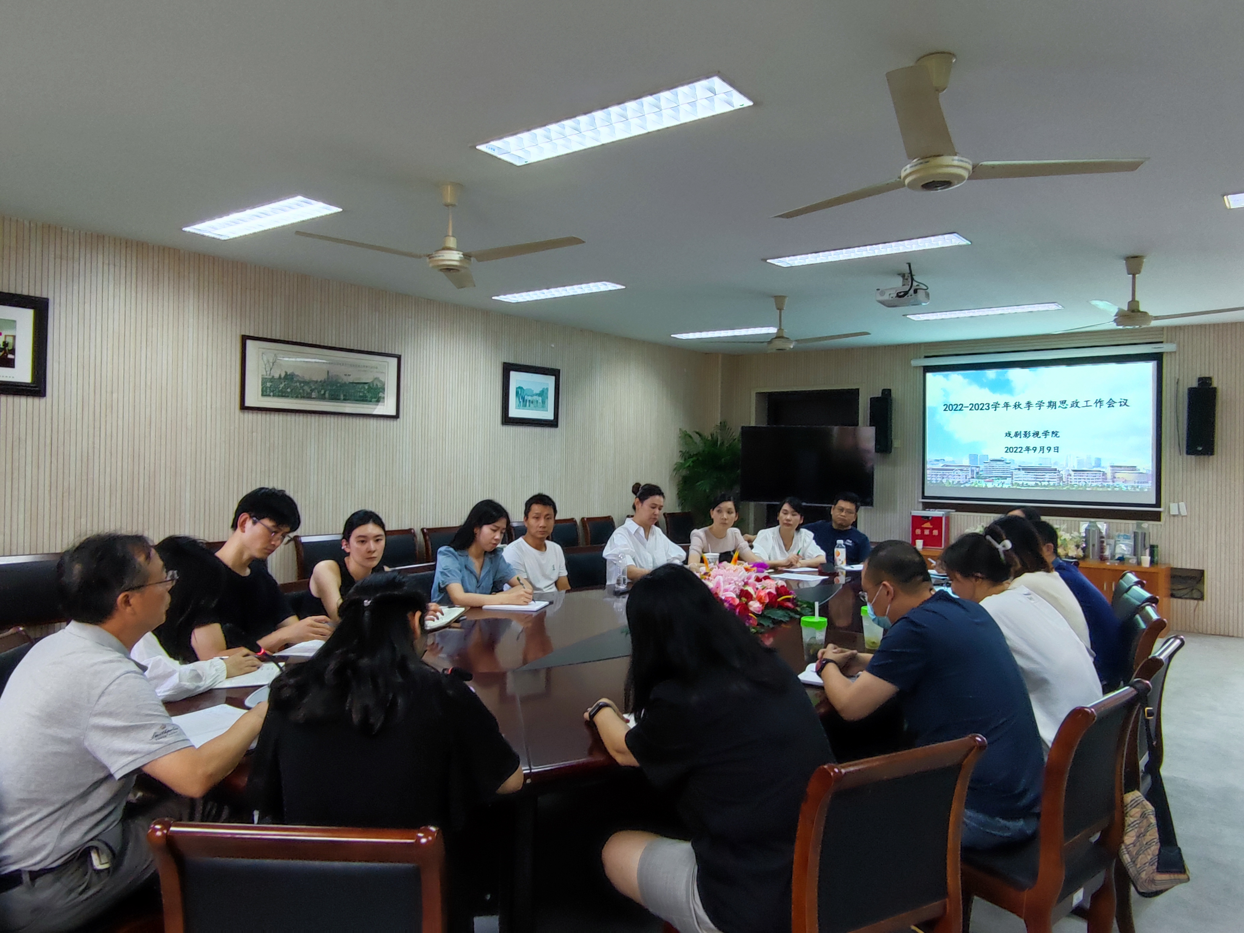 9月9日,戏剧影视学院在4210会议室召开2022-2023学年秋季学期思政工作会议。学院党总支书记彭云波、党总支专职副书记许瑛及全体辅导员、班主任参会,对开学工作做了充分的准备与部署。新学期我院将通过“1+1+N”工作机制,横向到边、纵向到底,全面覆盖学生教育管理。