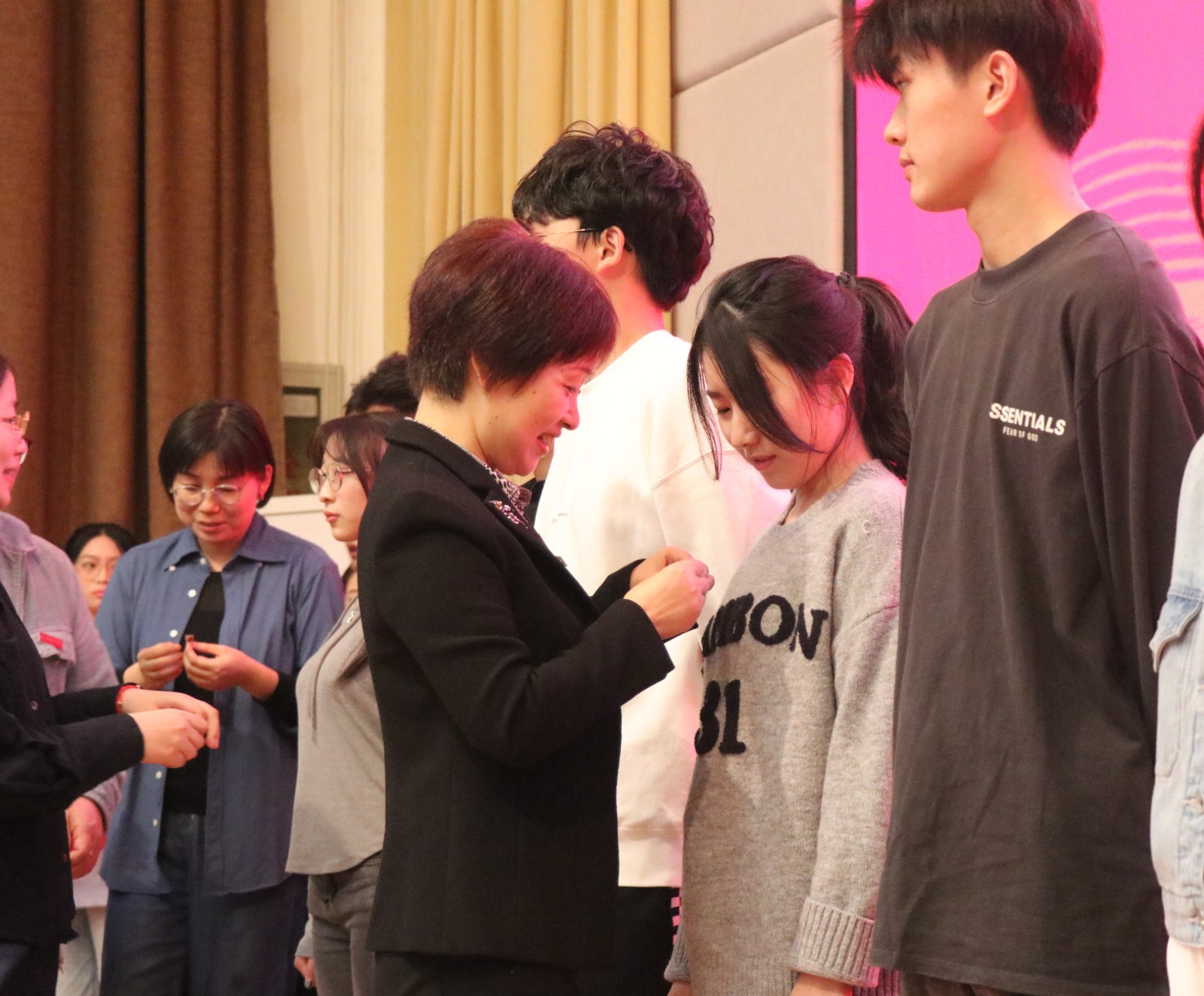 老师们为2022级新生代表佩戴校徽,他们胸口佩戴的不只是校徽,更是浙艺精神的寄托,是浙艺老师对学子的殷切期望。