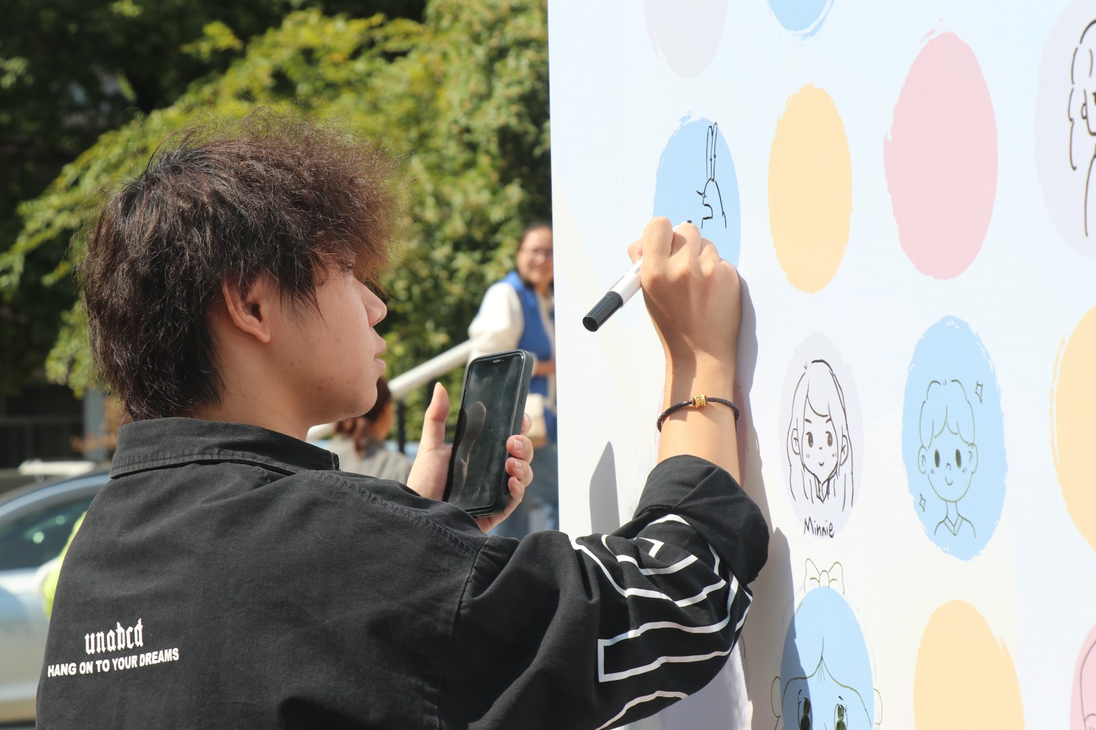 创意涂鸦签到入场,每位新生拿起画笔,带着朝气在签到板上涂鸦作画,用久违的童年彩笔描绘出个性的头像,留下独特的印记。