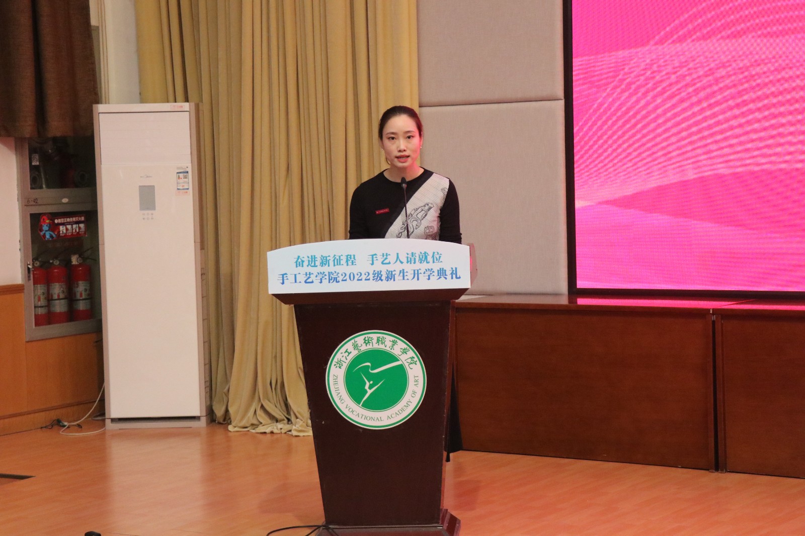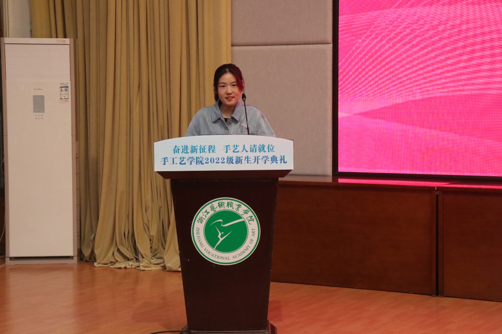 22文化创意与策划班任如意代表新生发言,发出手工艺学子的真诚誓言,表达立志成为有理想、敢担当、能吃苦、肯奋斗的新时代好青年的信心和决心。