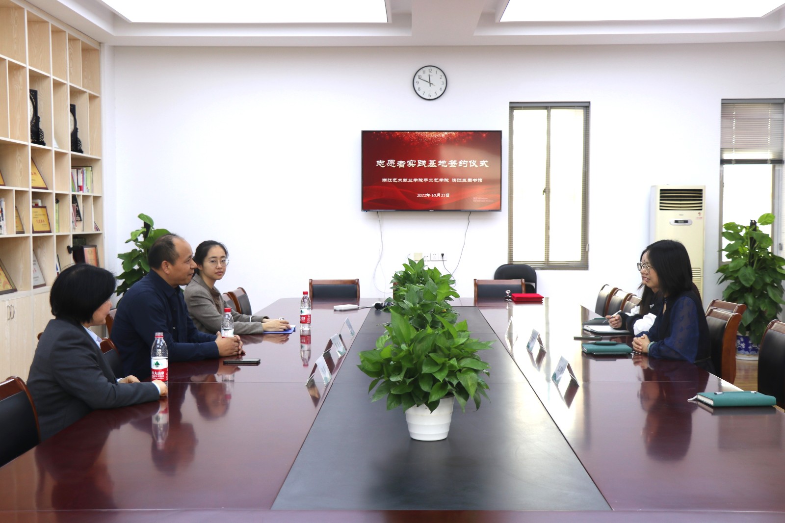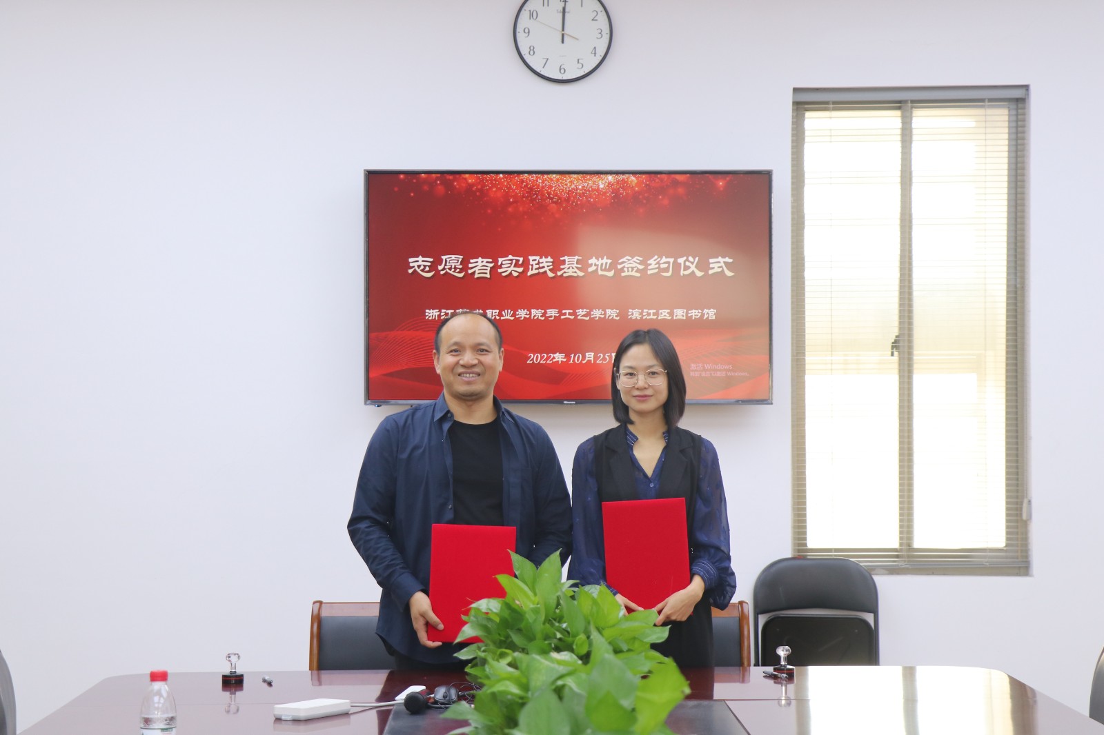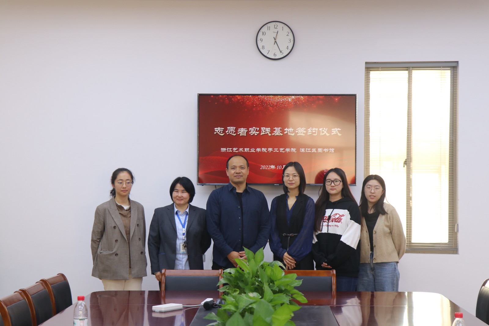 10月25日,手工艺学院与滨江区图书馆签订志愿者实践基地协议。手工艺学院党总支专职副书记王筱芽,辅导员胡墨智丽、戚幸怡,滨江区图书馆馆长陈晓波等一行出席签约。