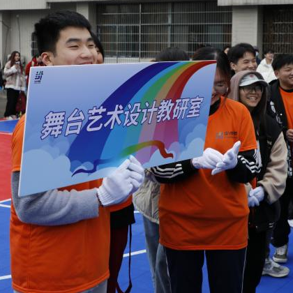 伴随着激昂的《运动员进行曲》,设计学院首届趣味运动会的开幕仪式以师生拔河比赛的形式启动。由设计学院舞台艺术设计与制作专业、服装与服饰设计专业、广告艺术设计专业、动漫设计专业、环境艺术设计专业、造型基础(附中)专业师生以及“七号舍友”代表组成的七支拔河队伍摩拳擦掌,各展风采,嘹亮地喊出属于他们的口号。