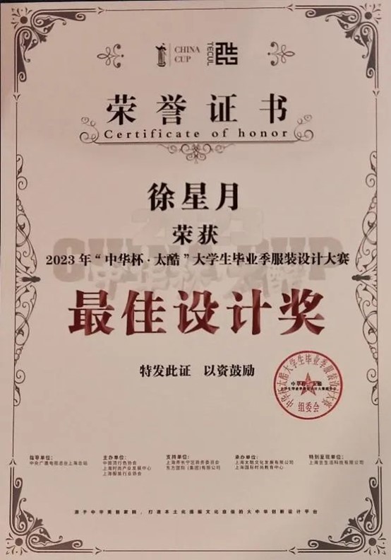 3月27日晚,由中国流行色协会、上海时尚产业发展中心、上海服装行业协会共同主办的“中华杯•太酷”大学生毕业季服装设计大赛决赛暨颁奖典礼在上海静安800秀举行。近千件大学生毕业设计作品,经过初评复评,于当晚角逐评出最终大奖。设计学院服装与服饰设计专业邱佳琪和徐星月的《一卯异樣》作品在全国3000多份作品的选拔中脱颖而出,入围大赛总决赛并荣获主赛道“最佳设计奖”,项敢获优秀指导教师奖。作品在复评阶段即参加了AW23上海时装周MODE商贸订货会,通过订货交易场景直面各地买手,获得商业尝试和实验机会。
