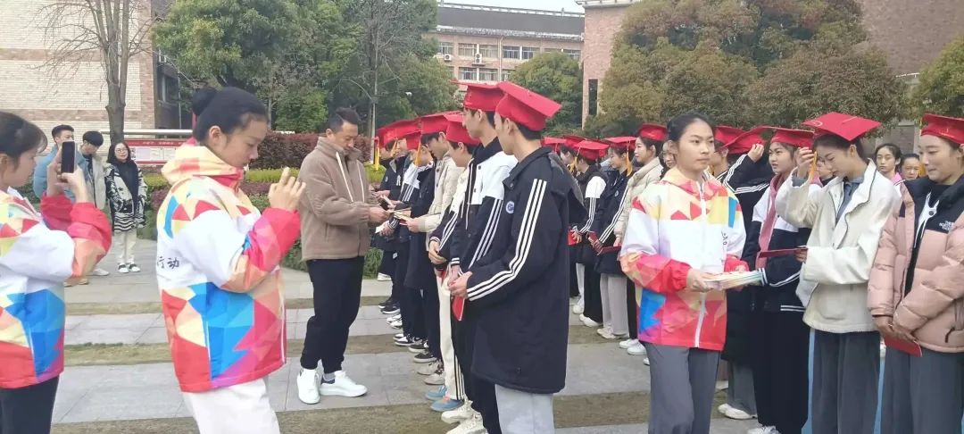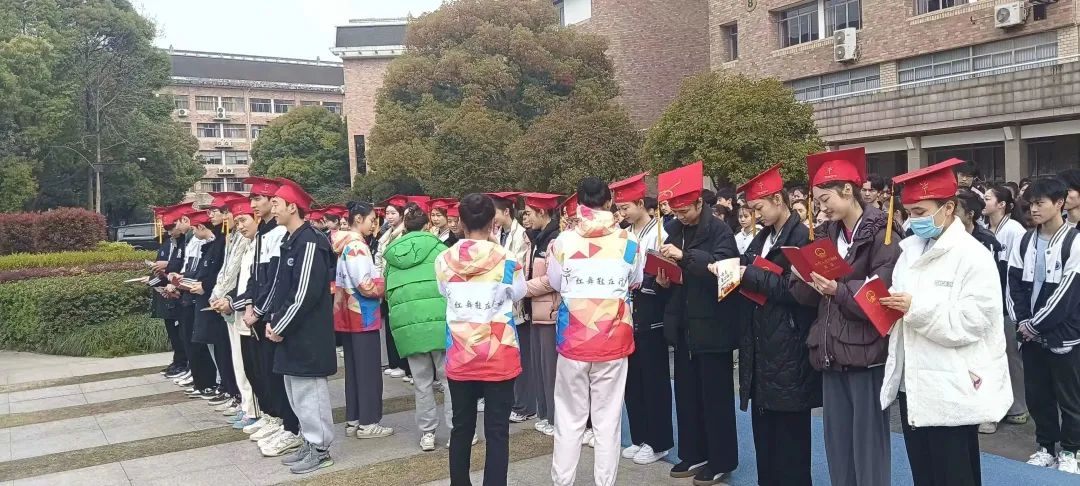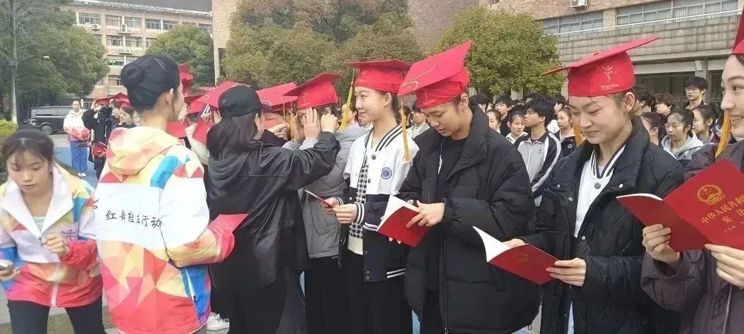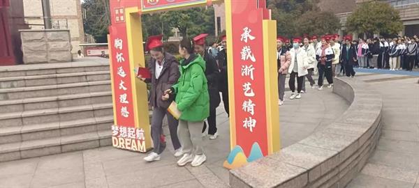 在庄严的国歌声中,五星红旗冉冉升起,老师们为34名同学佩戴上成人帽并颁发《中华人民共和国宪法》。全体同学头戴成人帽,手持宪法,面向国旗庄严宣誓:“我将胸怀远大理想,承载浙艺精神,立志成为担当民族复兴大任的时代新人,为中华民族的伟大复兴奋斗终身。”