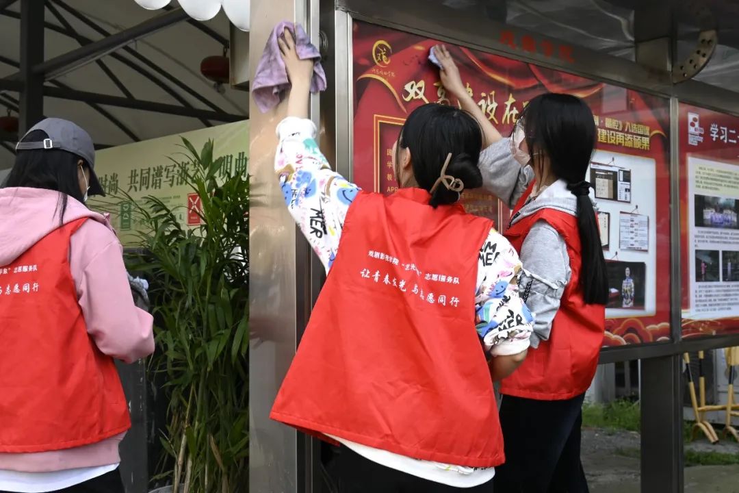 “艺光印象”志愿服务队的“小雷锋”们带着抹布、扫帚、垃圾夹等清扫工具,对教室、排练厅、实训室等场地进行了打扫,并清理了校园绿化带内的包装袋、纸屑等垃圾杂物,用汗水换来了校园的干净与整洁。