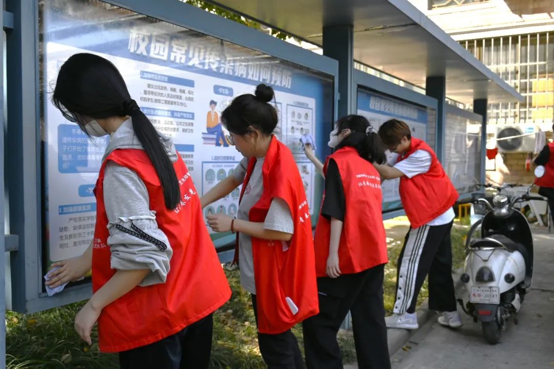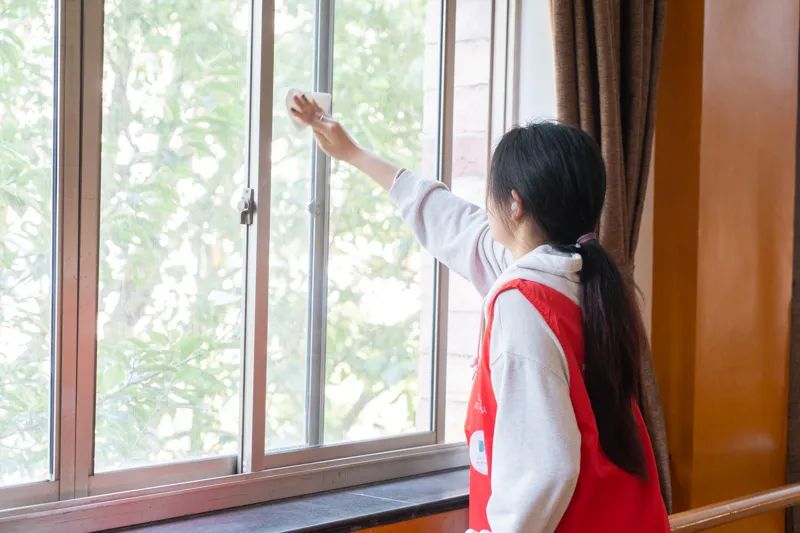 同学们认真清理着校园宣传栏上的灰尘,使原本有些许黯淡的宣传栏变得明亮通透、焕然一新。“艺光印象”志愿服务队中“小雷锋”们用实际行动弘扬“奉献、友爱、互助、进步”的志愿者精神和新时代雷锋精神。