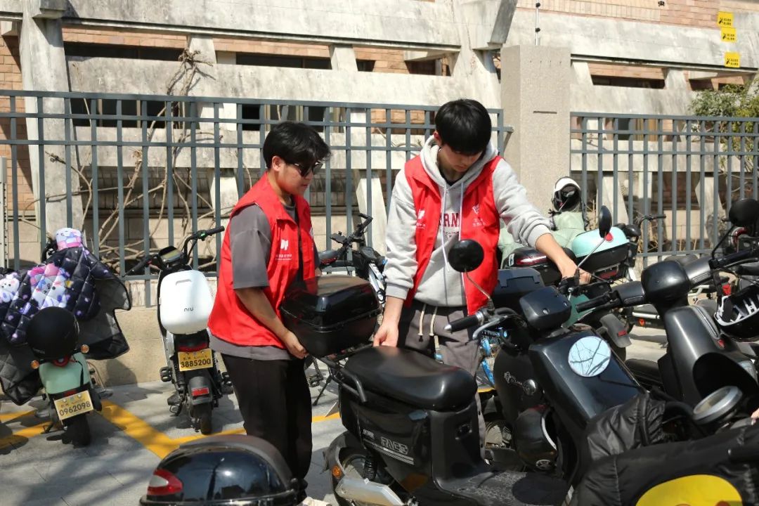 同学们在校门口、教学楼等多个停车区域积极进行志愿服务。扶起、有序摆放非机动车,清理共享单车车篓内的垃圾。经过同学们的努力,非机动车的摆放更具规范性,停车位变加整洁干净。“艺光印象”志愿服务队中“小雷锋”们的行动也影响着路过的同学,发挥着正向引导作用。