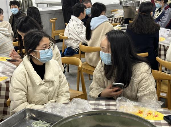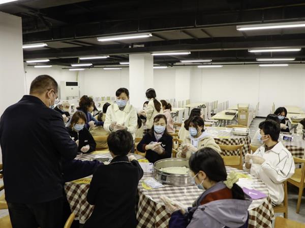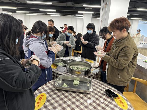 活动现场,热闹非凡。食堂师傅为大家详细讲解做青团的步骤,包括面团的揉搓方法、青团的包制手法和蒸制方式等。师生们相互配合、团结协作、忙活开来:倒糯米粉、拌艾草汁、揉搓成团、擀皮包馅……互相诉说着自己家乡清明节的习俗。