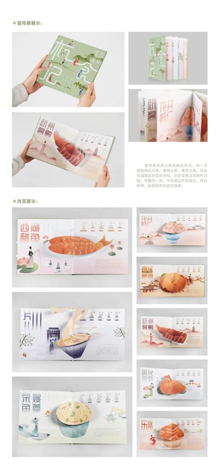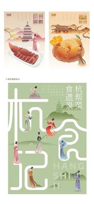 设计说明:该设计以“杭帮菜”为主题,旨在让更多人了解“杭帮菜”的特色与历史,宣传杭州的饮食文化。“杭帮菜”起源于距今一千多年的宋朝,我们将宋韵文化融入到视觉图形插画中,从多方面、多层次诠释“杭帮菜”的定义。以八种经典杭帮菜为主体,将杭州著名景点及建筑融入到花草树木、水泽山川中,再辅以“宋代女子”为蓝本设计的IP人物形象,以视觉鲜明的菜品、淡雅脱俗的景观、精巧动态的人物形象三者合一,创作出全方位宣扬“杭帮菜”与杭州饮食文化的作品。