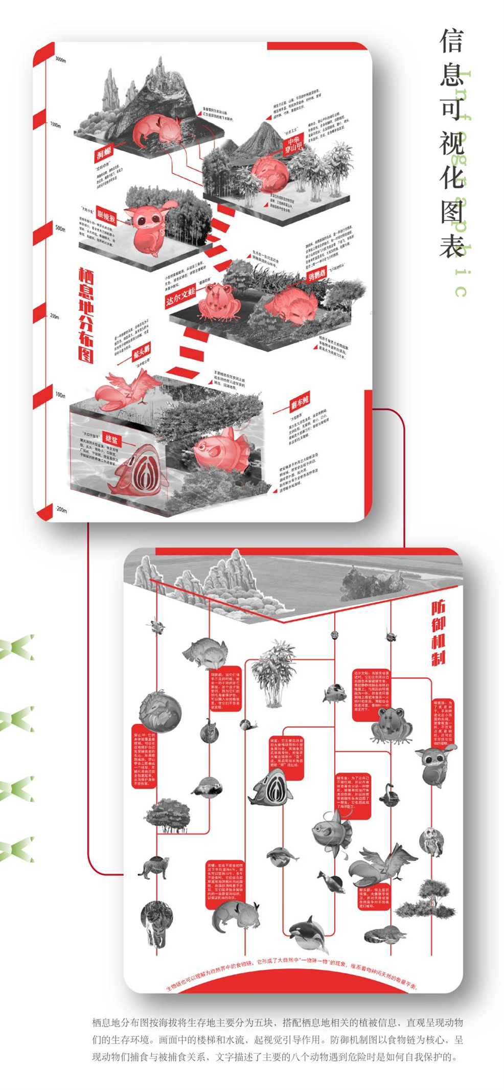 设计说明:大自然创造了许多美丽可爱、富有灵气的生命,但随着社会的极速发展,大量的生灵由于自然灾害、人类经济活动、栖息地的急剧变化、猎杀等原因濒临灭绝,令人痛惜。本主题以濒危动物保护为切入点,采用多元化的手法重塑濒危动物形象,通过文创设计的形式向大众普及濒危动物知识。作品通过抽象几何风格的海报、卡通萌系插画、动物信息科普可视化图表、live2D游戏互动、3D角色盲盒等表现形式,将二维与三维多媒体技术结合,以丰富新颖的视觉表现形式来呼吁社会对该话题的关注。