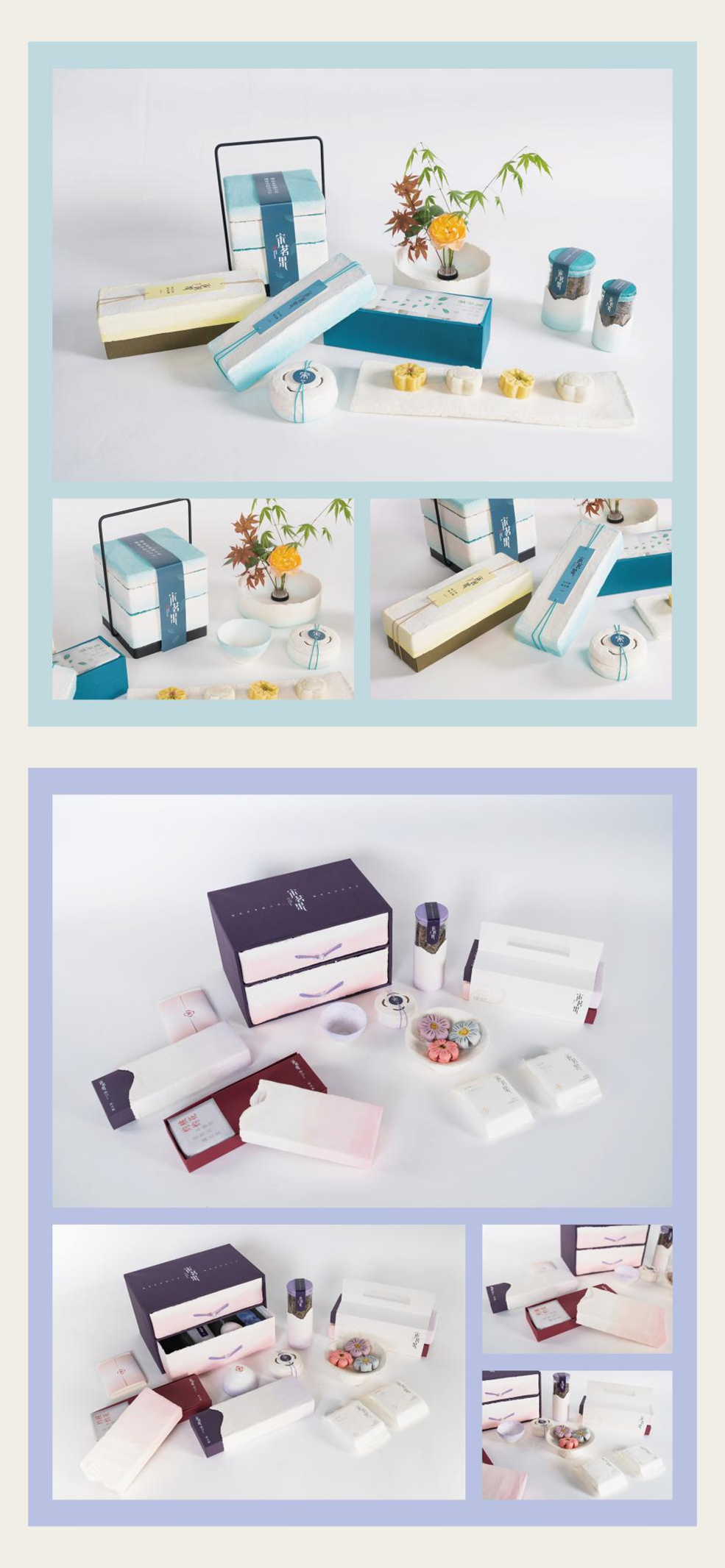 设计说明:本课题项目以宋韵文化为背景,打造了一个中式茶点自创品牌——“宋茗果”。在包装材料上选择可塑性较强且环保的纸浆,运用纸浆塑型工艺制作包装容器,提高了保护性和可重复使用性。纸浆有明显的肌理感,搭配一系列从宋代五大窑中提取的色彩,如“暮山紫”“西子”等,使包装有古朴素雅的质感。包装主要盒型有四种:天地盖和抽拉式的中包装,以食盒为原型的小礼盒装和抽屉式的大礼盒装。此外根据宋代四艺,还制作了建盏、焚香盒、花瓶等衍生品,使人们感受到宋代独具韵味的生活美学。