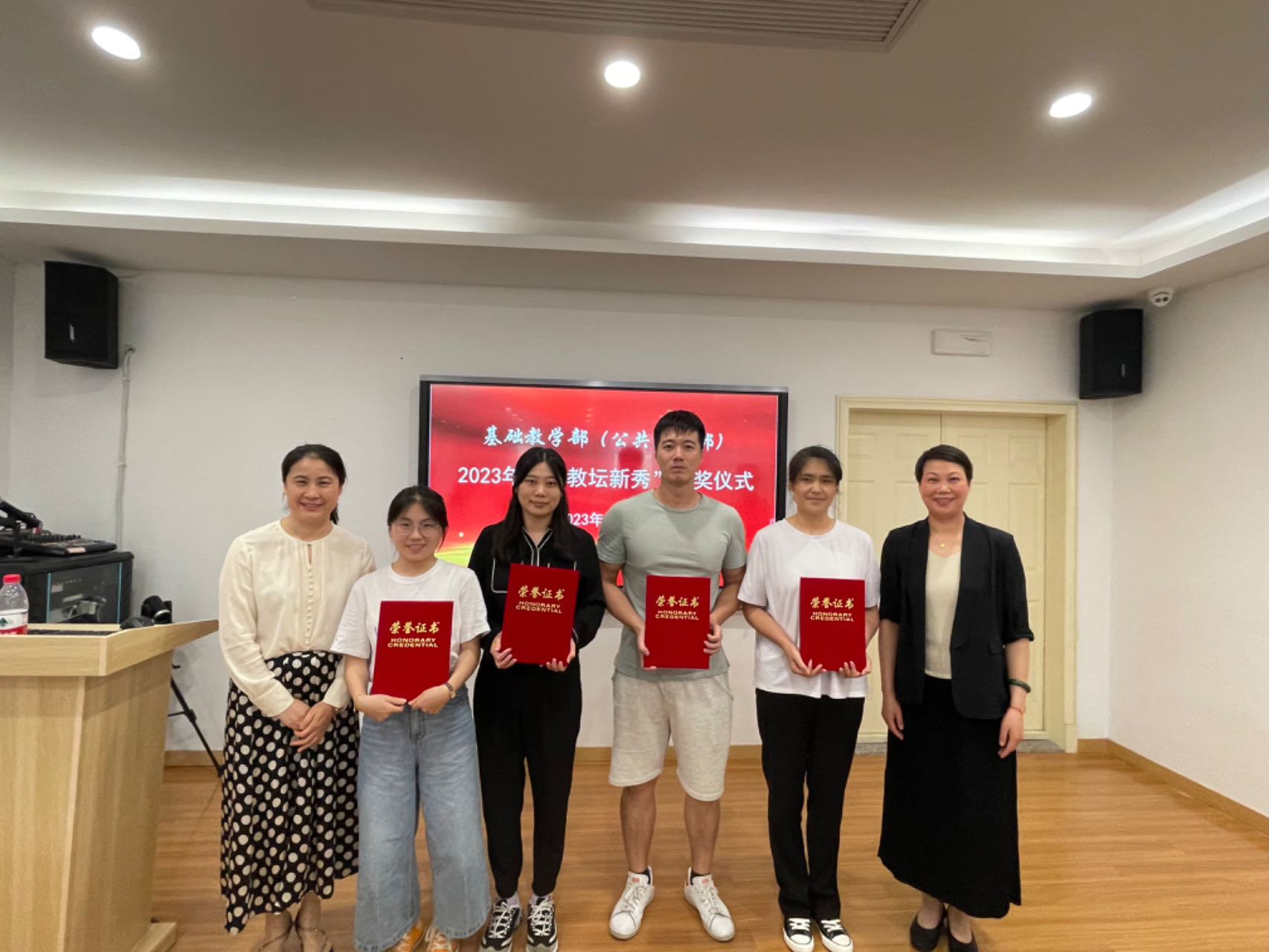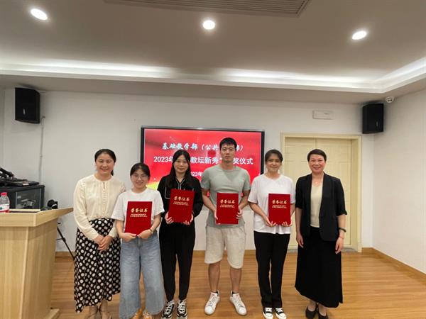 6月21日下午,基础部(公体部)在图信中心四楼研讨室举办2023年度部门“教坛新秀”表彰仪式。基础部党总支书记郑园全和副主任邢晓丽为获奖教师颁奖并合影留念。