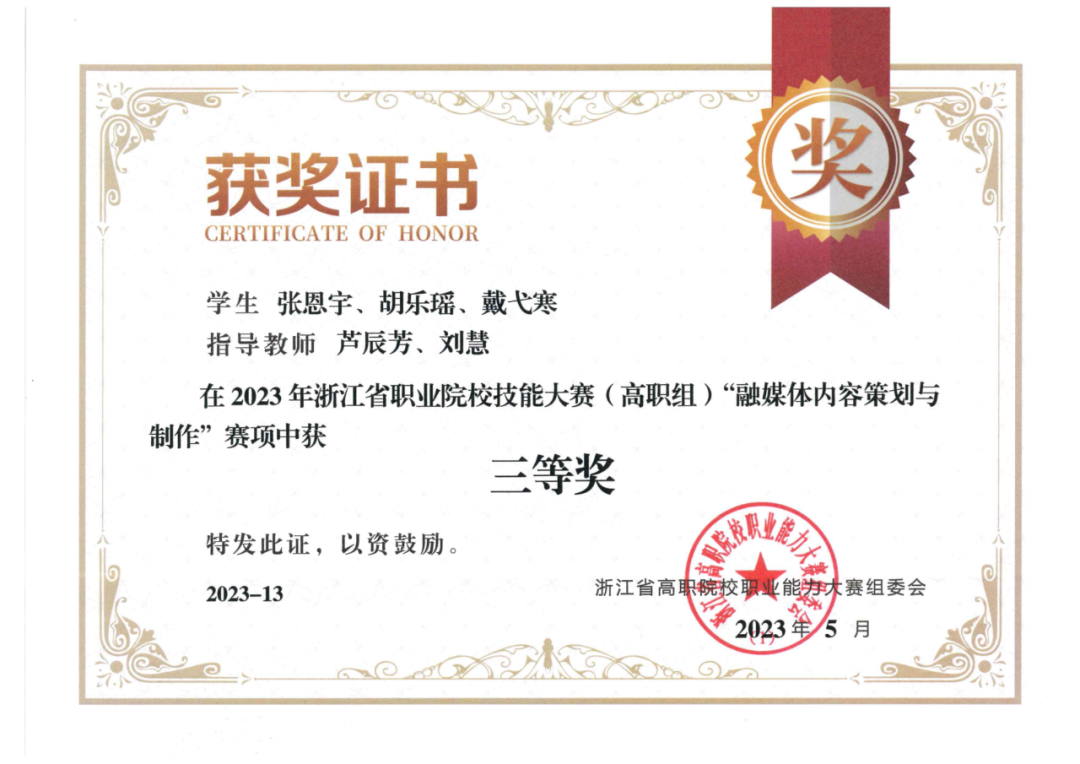 2023年浙江省高职院校技能大赛暨全国职业院校技能大赛选拔赛“融媒体内容策划与制作”“短视频制作与运营”赛项于5月21日和5月27日陆续开赛,戏剧影视学院共斩获1个一等奖、2个三等奖。