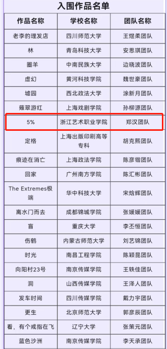 近日,由浙艺戏剧影视学院摄影摄像技术专业教师孙国虎指导,2019级摄影摄像技术专业学生郑汉、陈昱帆、傅晓琦、厉楠、陈凯琦等创作的实验短片《5%》,荣获第十九届广州大学生电影展“追梦路上”原创特别单元“优秀作品”,第五届极光之夜·大学生微电影节“最佳摄影”“最佳音效”提名。