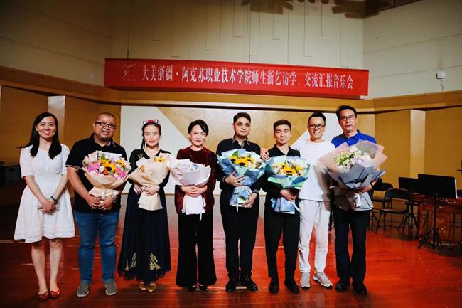 音乐学院院长吴樟华同师生代表一同回顾了三个月以来,西尔扎提江·依力哈尔老师与玉米提·阿里木同学在专业学习上情况,各类艺术观摩、实践演出、研学交流,形式多样,内容丰富,尤其是在“大美浙疆”——阿克苏职业技术学院师生访学、交流音乐会上,三位师生与音乐学院的教学团队一同展现了大美浙疆的艺术文化交融,艺术教育互学互鉴民族情谊悠久绵长。