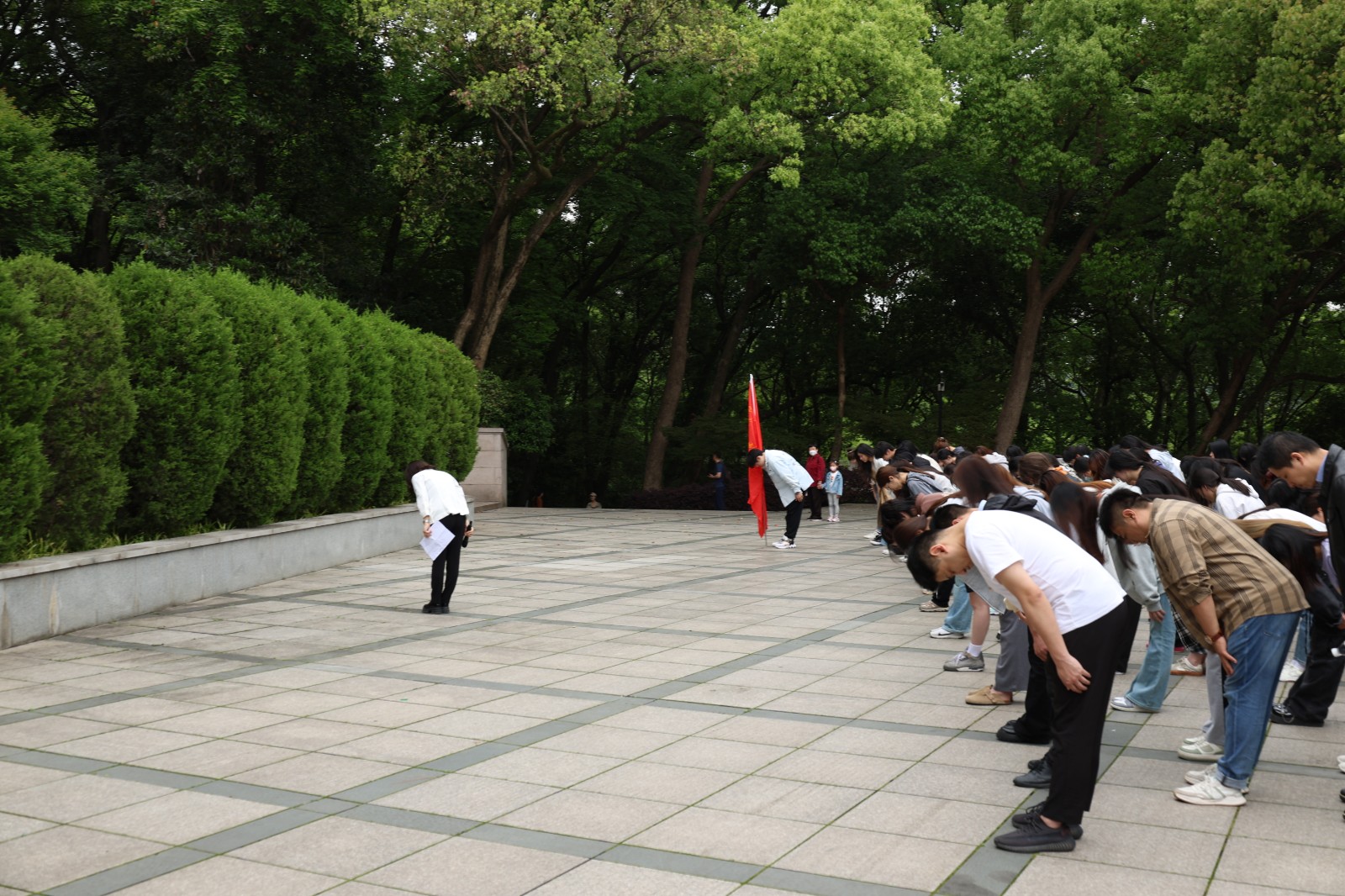 参观完毕,党校全体师生在蔡永祥烈士纪念碑前举行祭奠仪式。全体学员们行注目礼,两位党校学员代表向革命烈士敬献花篮,全体师生向烈士行三鞠躬礼,低头默哀,随后绕纪念碑一圈,瞻仰烈士像。