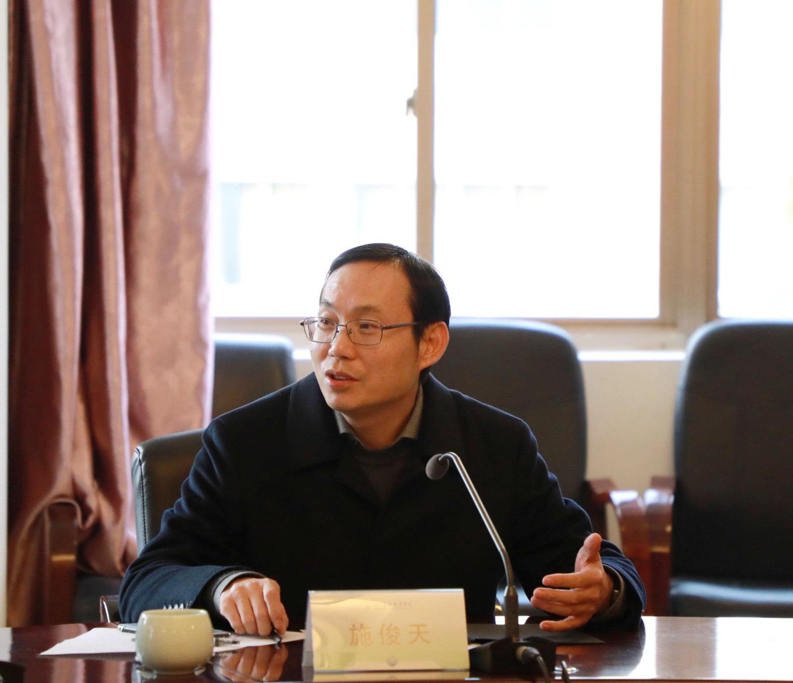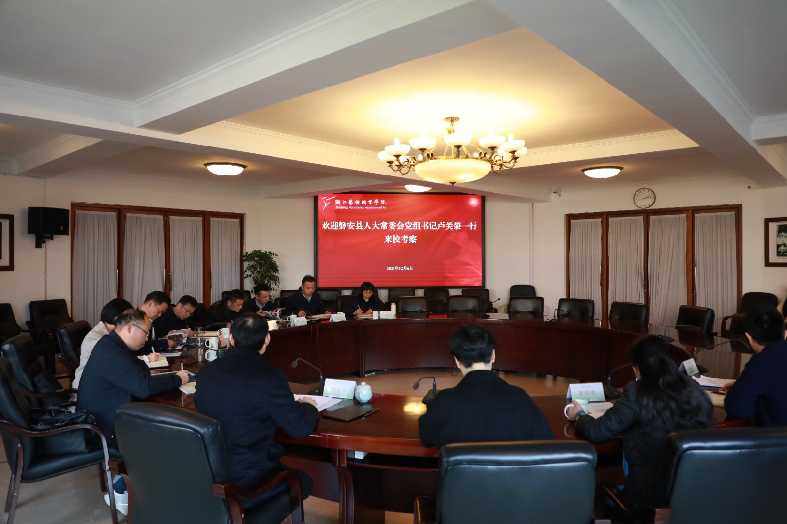 12月6日,磐安县人大常委会党组书记卢关荣一行来校考察。浙江艺术职业学院校长、党委副书记施俊天接待来宾并参加座谈。
