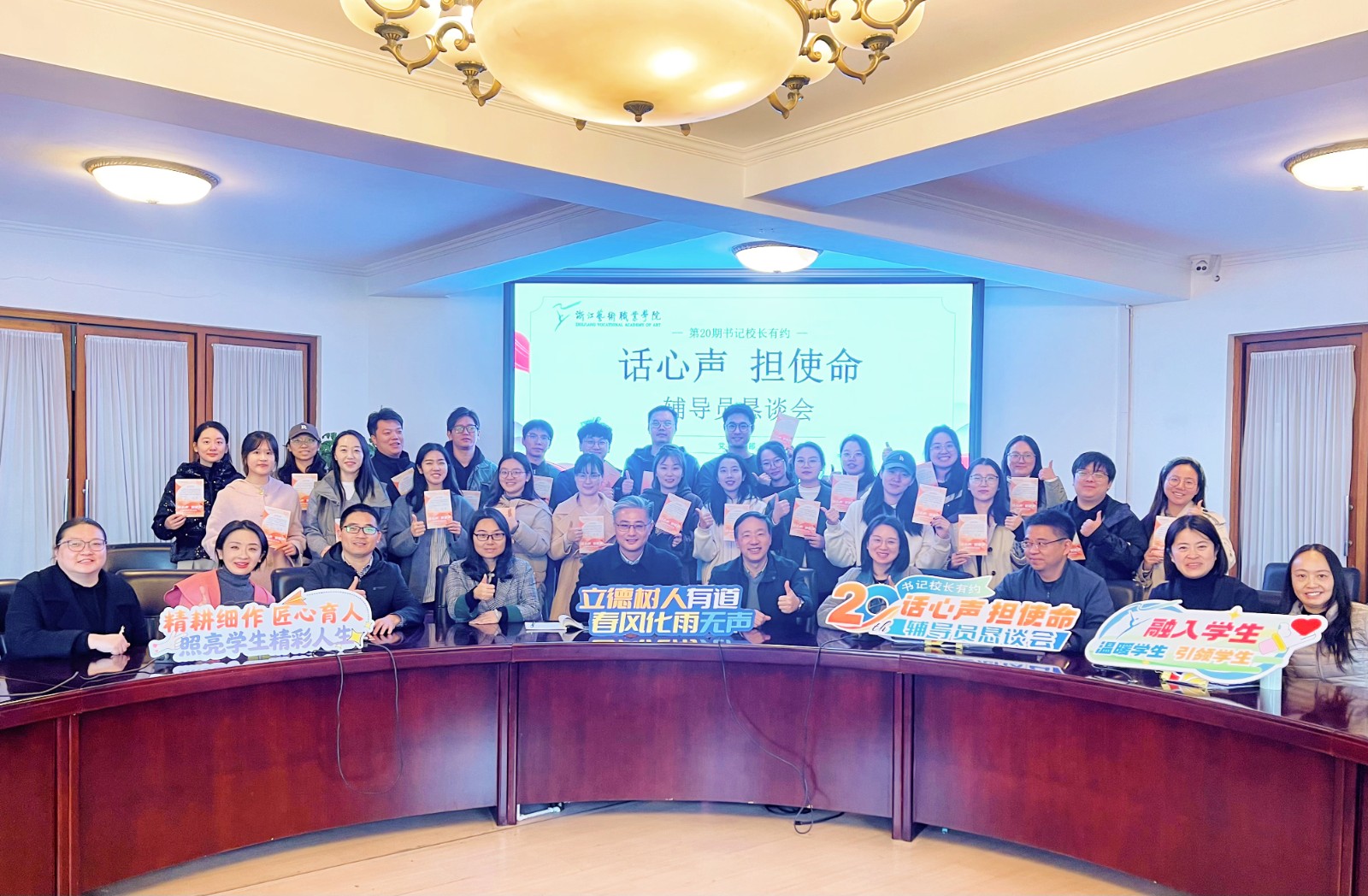 1126日下午,第20期书记校长有约暨“话心声 担使命”辅导员恳谈会在三楼大会议举行,校党委书记薛亮、党委副书记夏开堂,二级学院学生工作负责人及全体辅导员参加座谈,会议由学工部副部长吴颖主持。