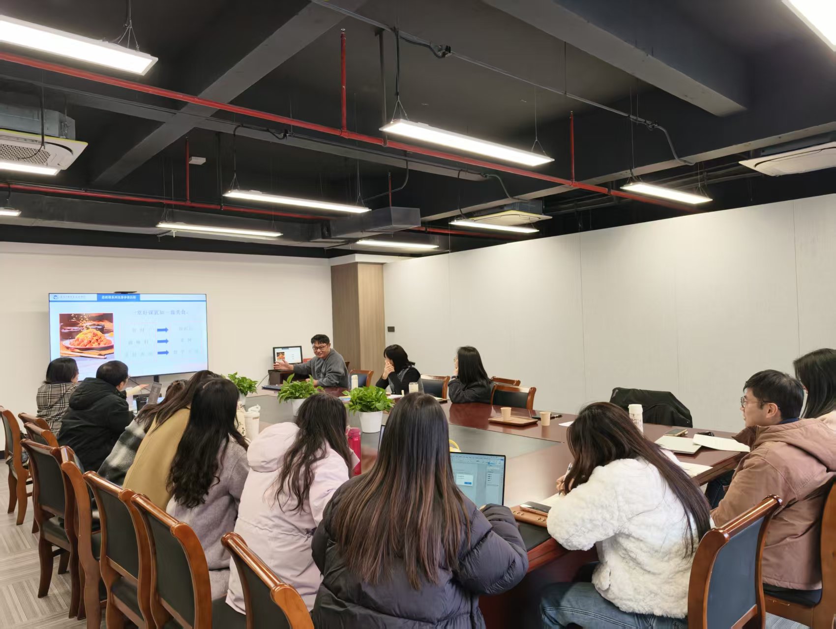 马克思主义学院副院长胡卓群介绍了马院老师今年参加省高职院校教学能力比赛思想政治理论课程组备赛整体情况。参赛选手陈丽丽、王儿两位老师依次播放教学展示视频,分享备赛心得与参赛感悟,她们结合自身备赛经历,从课程设计、课件打磨、团队协作、临场应变等多个维度,生动讲述了备赛过程中的艰辛与收获,深入剖析了比赛中的重难点问题及解决方案,为在场教师提供了宝贵的实践参考。