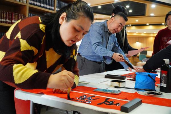 活动现场墨香四溢、暖意融融,充分展现了传统书画艺术的独特魅力。活动设置多重互动环节,既有专业书法教师挥毫示范,也为其他爱好书法的师生提供了亲身体验的机会:可提笔书写寓意吉祥的“福”字,将浓浓的新春祝福凝于笔端;可创作对仗工整的新春对联,让美好期许跃然红纸之上;还能在精巧书签上留下专属墨宝,亲手打造独一无二的新年纪念。此外,活动特别设置抽奖环节,进一步点燃了师生的参与热情,现场欢声笑语不断。