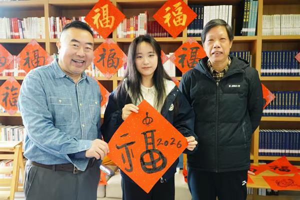 活动热度还延伸至校园各处,食堂门前特设的“送福处”格外热闹。红纸铺展,翰墨飘香,老师们将提前书写好的“福”字与春联赠予来往师生。大家欣然接过这份特殊的节日礼物,笑语与祝福声交织,为冬日校园平添了一抹温暖的年味。不少师生举起“福”字与春联合影留念,镜头记录下这份亲手传递的温暖,更凝聚起全校师生对新年的共同向往。