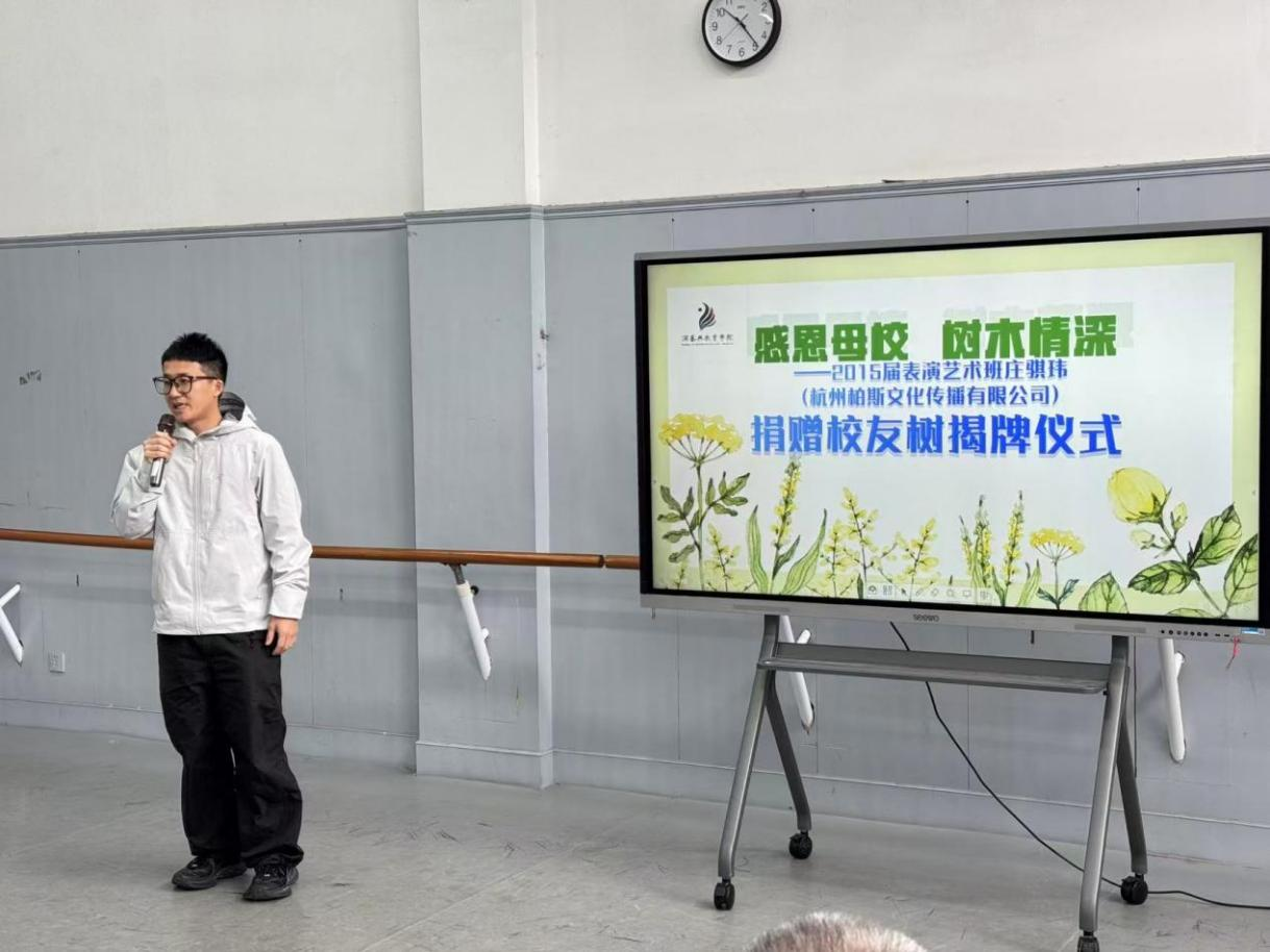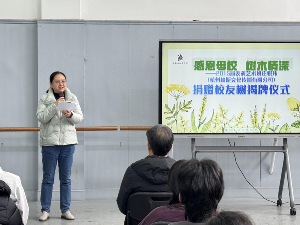 演教学院党总支书记戴闵青向出席本次活动的领导、嘉宾及师生表示热烈欢迎,详细介绍了学校教育发展基金会的建设发展情况,并对庄骐玮心系母校、反哺育人的善举致以诚挚谢意。她表示,庄骐玮以企业名义为母校70周年校庆捐赠五千元认捐校友树,将对母校的深情厚谊化作实际行动,充分彰显了浙艺校友的使命担当。