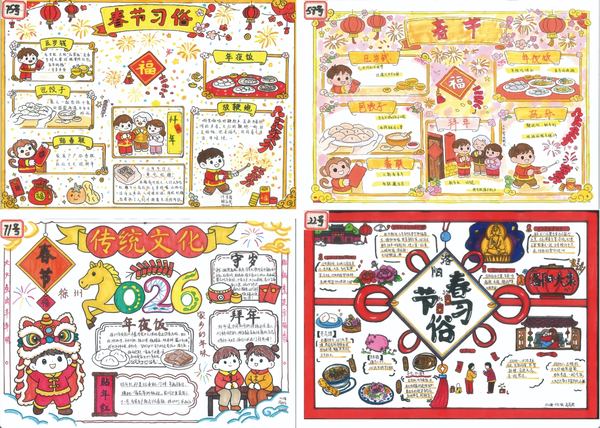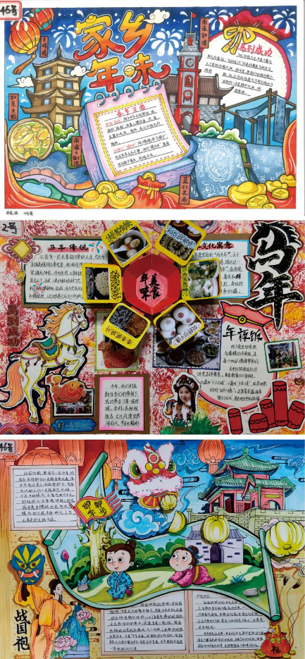 本次活动自2026年寒假启动,面向纯中专初中段学生开展。同学们以家乡年味为主题,走进街头巷尾、记录团圆时刻,将年俗风情、家乡美食、故土美景等元素融入手抄报创作。所有参赛作品均为原创,以A3及以上画幅,用细腻线条与斑斓色彩,表达了对年味的纯粹理解和对家乡的深情,成为中华文化在少年心中扎根的生动见证。