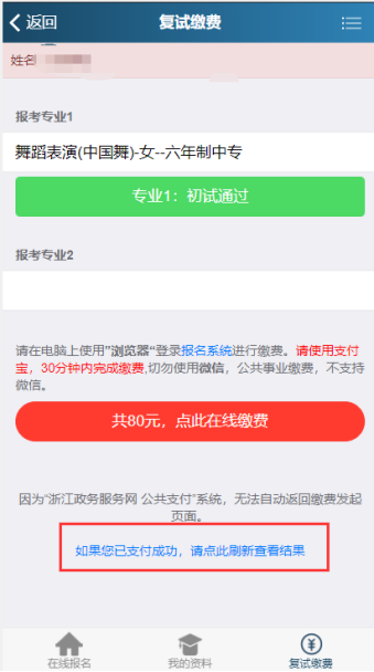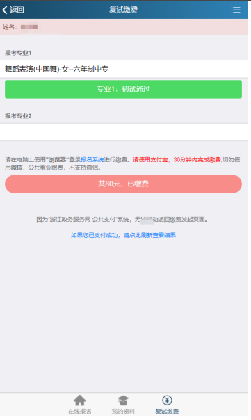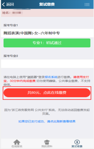 2.考生最多只能报考进入复试专业中的两个专业,请注意专业志愿顺序(采取平行志愿录取)复试费一个专业80元,两个专业120元(仅支持支付宝缴费)