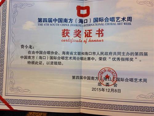 中国合唱协会、海南省文联和海口市政府共同主办,海南省合唱协会和海口市文体局共同承办的第四届中国南方(海口)国际合唱艺术周于12月5日-9日在海口市人民大会堂举行。浙江艺术职业学院青年合唱团作为浙江省唯一一支参赛团队,喜获成人混声组、成人女生组、成人声乐组合(男声)组三个组别的金奖,合唱团指挥费小龙荣获优秀指挥奖。