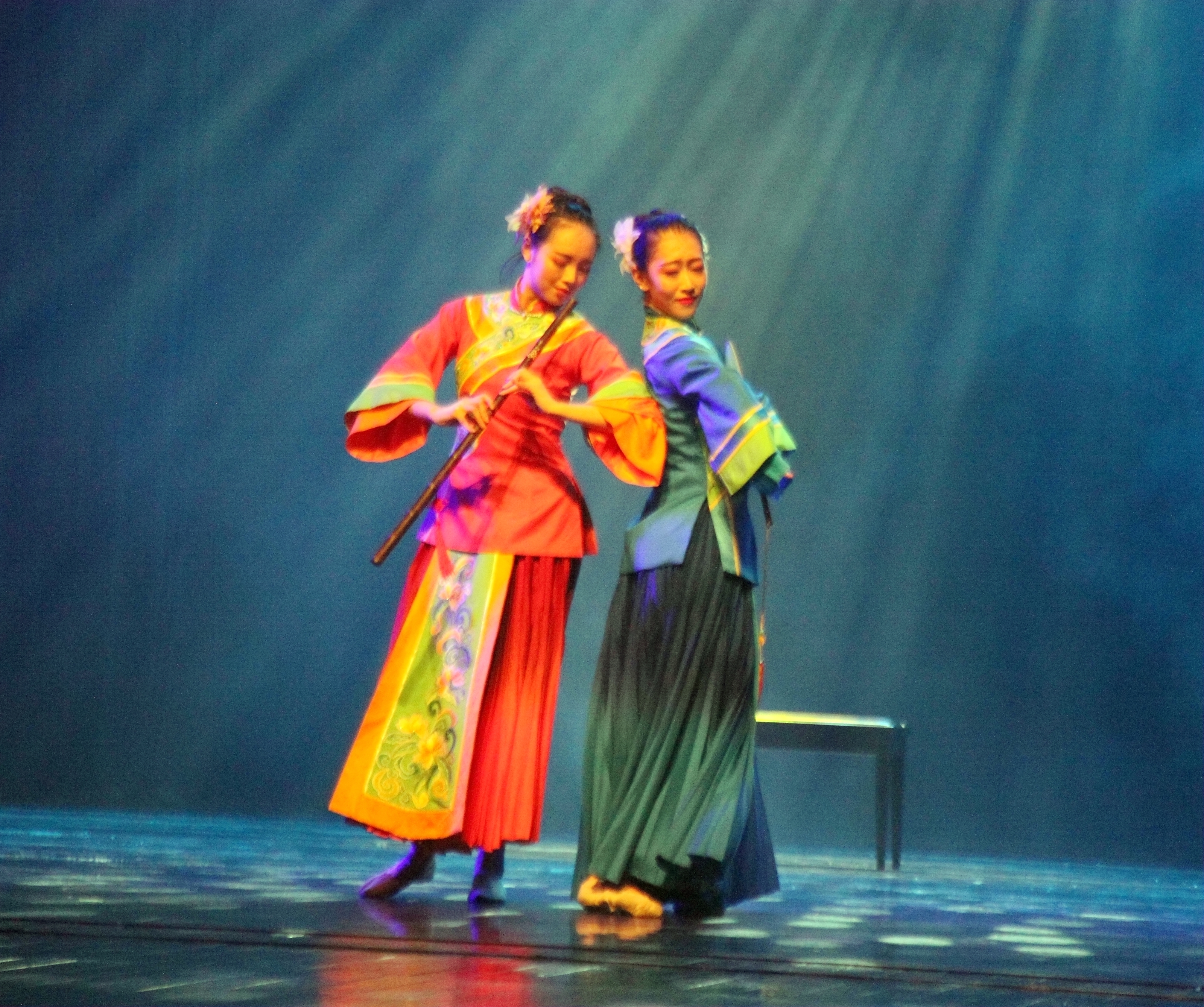 整场节目由舞蹈系青年教师包峥剡执导,兼具学院派年轻人的青春朝气和江南文化的旖旎秀丽。开场第一个节目原创女子群舞《花鼓声生》由浙艺青年教师包峥剡、朱婷编导,取材自“瑞安花鼓”,有着浓郁的浙南特色,将花朵的形象与江南少女的俏丽柔美构成婉约的舞蹈意象;花鼓姑娘之后迎来白衣飘飘的音乐系女生王璟,她独唱的《美丽浙江》向观众描摹了浙江的山山水水,“日出东海月落西塘,碧水千岛青山雁荡,普陀梵音兰亭文章,品茶西子观潮钱江”;琵琶与舞蹈《十面埋伏》是经典名曲与舞蹈新作的交融,音乐系教师张凌弹奏,楚汉之战正酣,琵琶声激越,霸王是“力拔山兮气盖世”,刘邦是“大风起兮云飞扬”,舞者汤陈博在舞台一侧用身体语言讲述着战场上的惨烈故事;戏剧系青年教师吕静演绎的越剧名段《西湖山水还依旧》脍炙人口,伴舞女生手中一把青伞熏染出“西湖山水”的轻柔;男声独唱《一杯美酒》马上把气氛调动得欢快起来,音乐系青年教师谢志勇唱出了这首维吾尔族民歌的热辣热情;板胡独奏《春城节日》,表演者音乐系教师卢伟仿佛赋予了音符生命,一个个随着琴弦飞出来,飞进身体,飞进每一个细胞,欢快舞动着;浙艺第一个获国家艺术基金项目的舞蹈《凳之龙》,本来有20多位演员,为了赴台特意排练了一个5人迷你版《凳之龙》,向台湾观众传达中华民族龙之“骨气”,最后人与凳子融为一体,构架出“展翅腾飞”的造型……