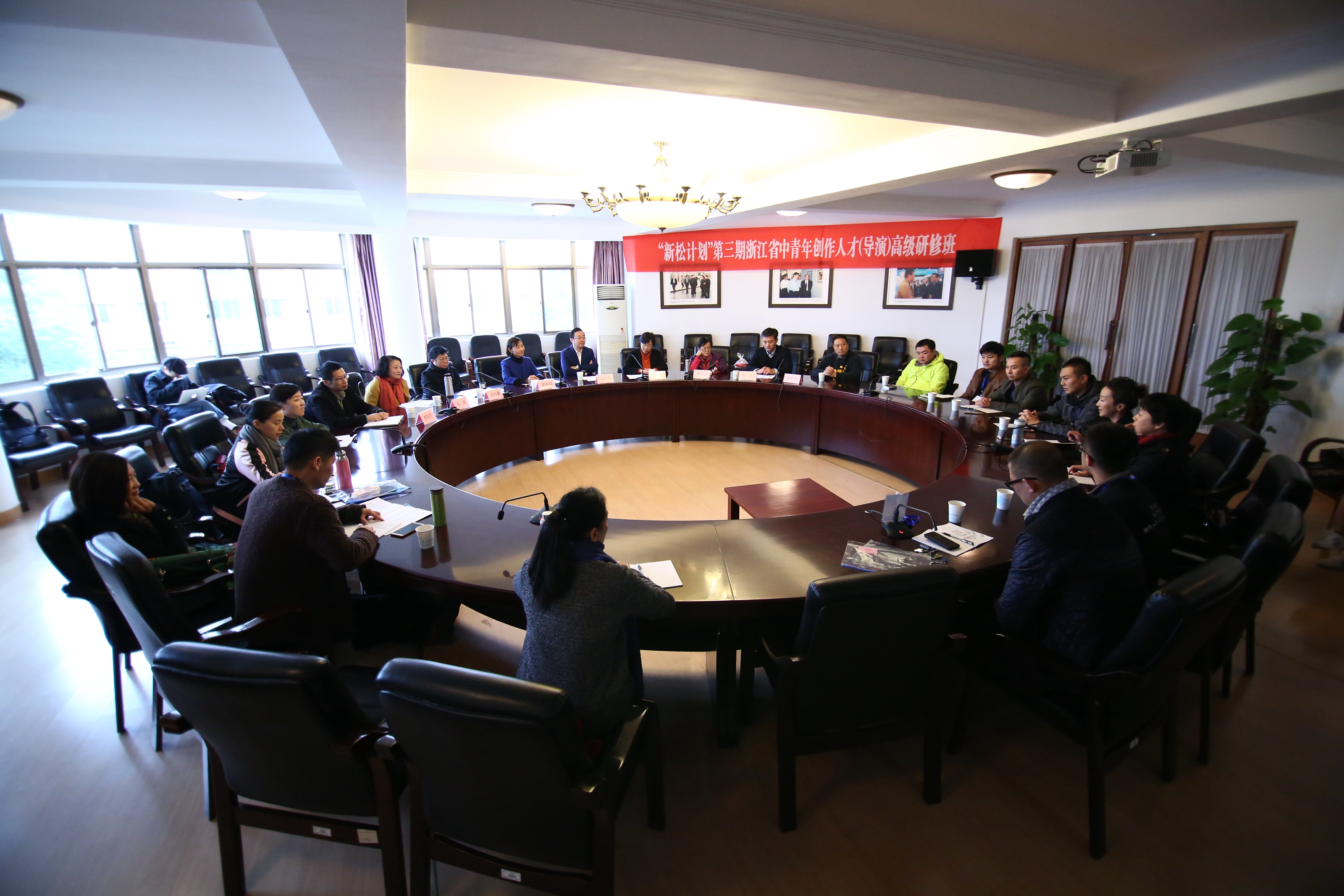 11月9日,“新松计划”第三期全省中青年创作人才(导演)高级研修班在浙江艺术职业学院开班。本期培训班师资团队名家荟萃,主教是浙江艺术职业学院特聘教授、一级导演杨小青,授课老师特邀中国国家话剧院一级导演、北京大学影视戏剧研究中心副主任、上海戏剧学院教授田沁鑫,上海戏曲艺术中心艺委会主任、一级编剧李莉,中央戏剧学院原副院长、博导罗锦鳞与戏文系主任、教授彭涛,上海戏剧学院教授、导演田蔓莎,著名舞美专家刘科栋、周正平、蓝玲,以及著名编剧、策划人史航、著名舞蹈编导李世博等。省文化厅副厅长刁玉泉、浙江艺术职业学院党委书记朱海闵,教师代表杨小青、田沁鑫,省文化厅艺术处处长薛亮,以及负责此次高研班的浙艺戏剧系主任支涛等教师、高研班全体学员参加开班仪式。院长黄杭娟主持。