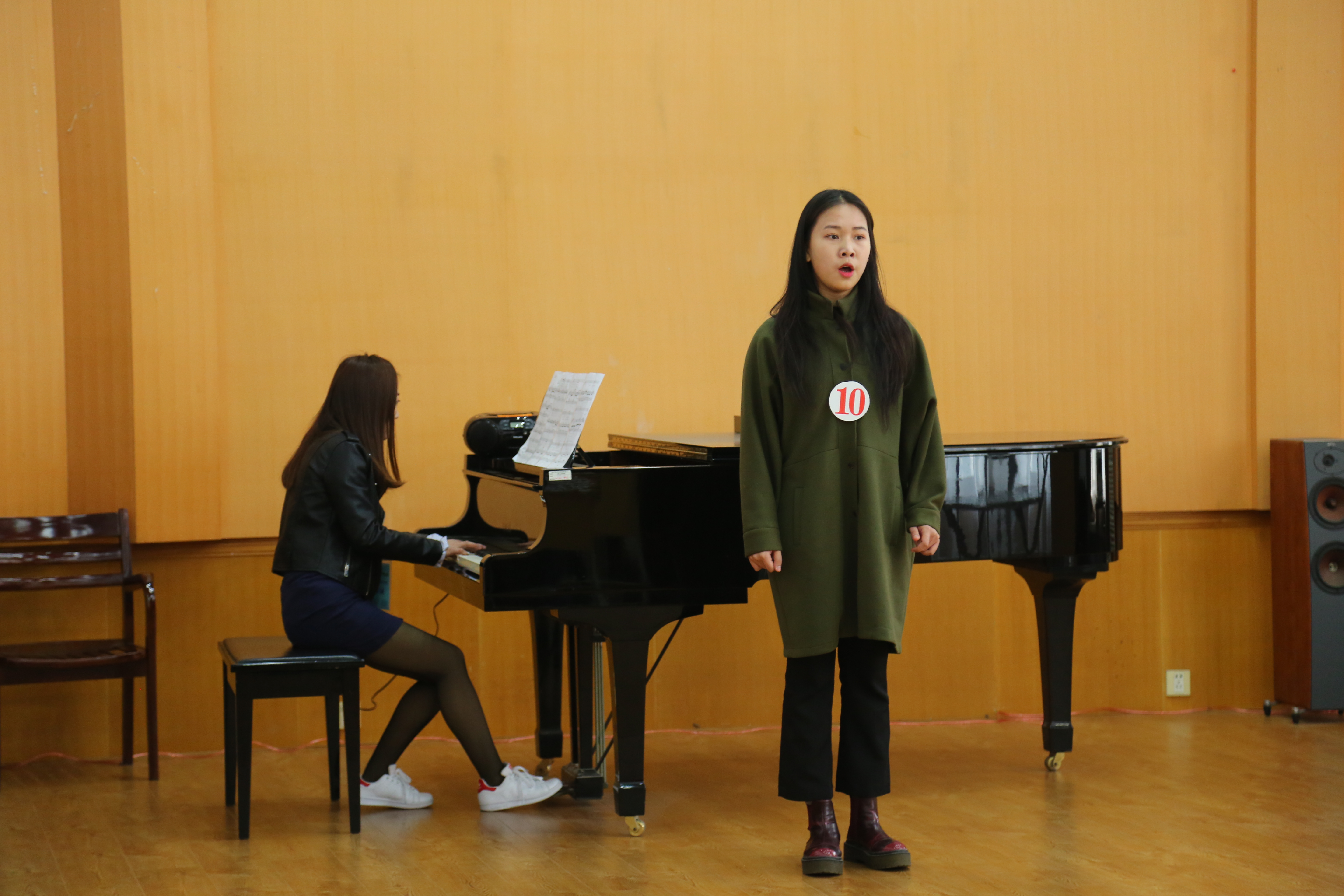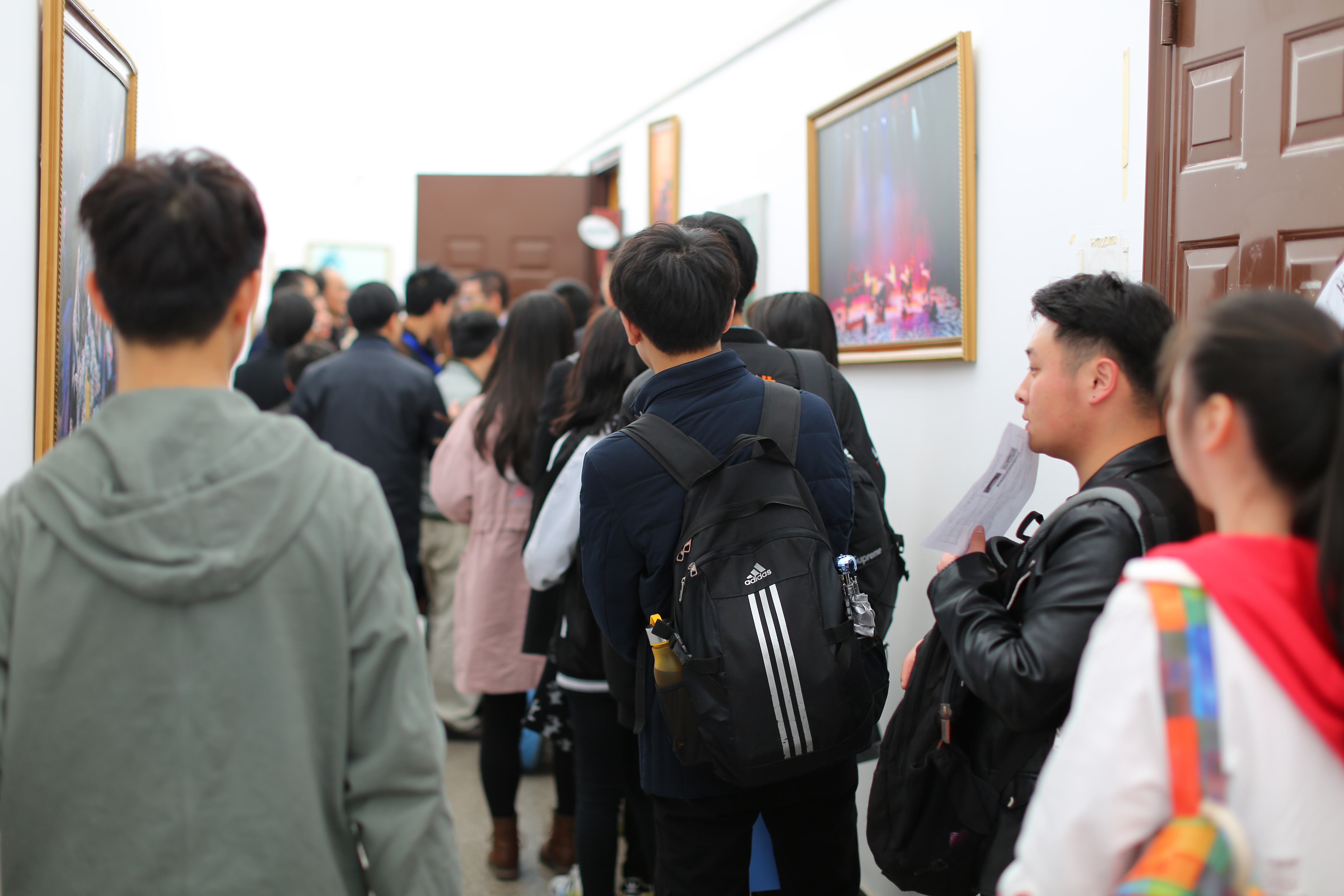 音乐系的专业考试,是先闻其声再见其人。楼道里候考的考生都在调试乐器打开嗓子,回荡着各种小声哼唱或弹拨乐器的声音,虽然没有考场里的洪亮高亢,但也有条不紊地准备着。歌舞表演专业更是各怀才艺,唱歌剧、民歌、美声的,跳民族舞、现代舞的,让人目不暇接。声乐考场外考生排着队时还在复习手中乐谱。