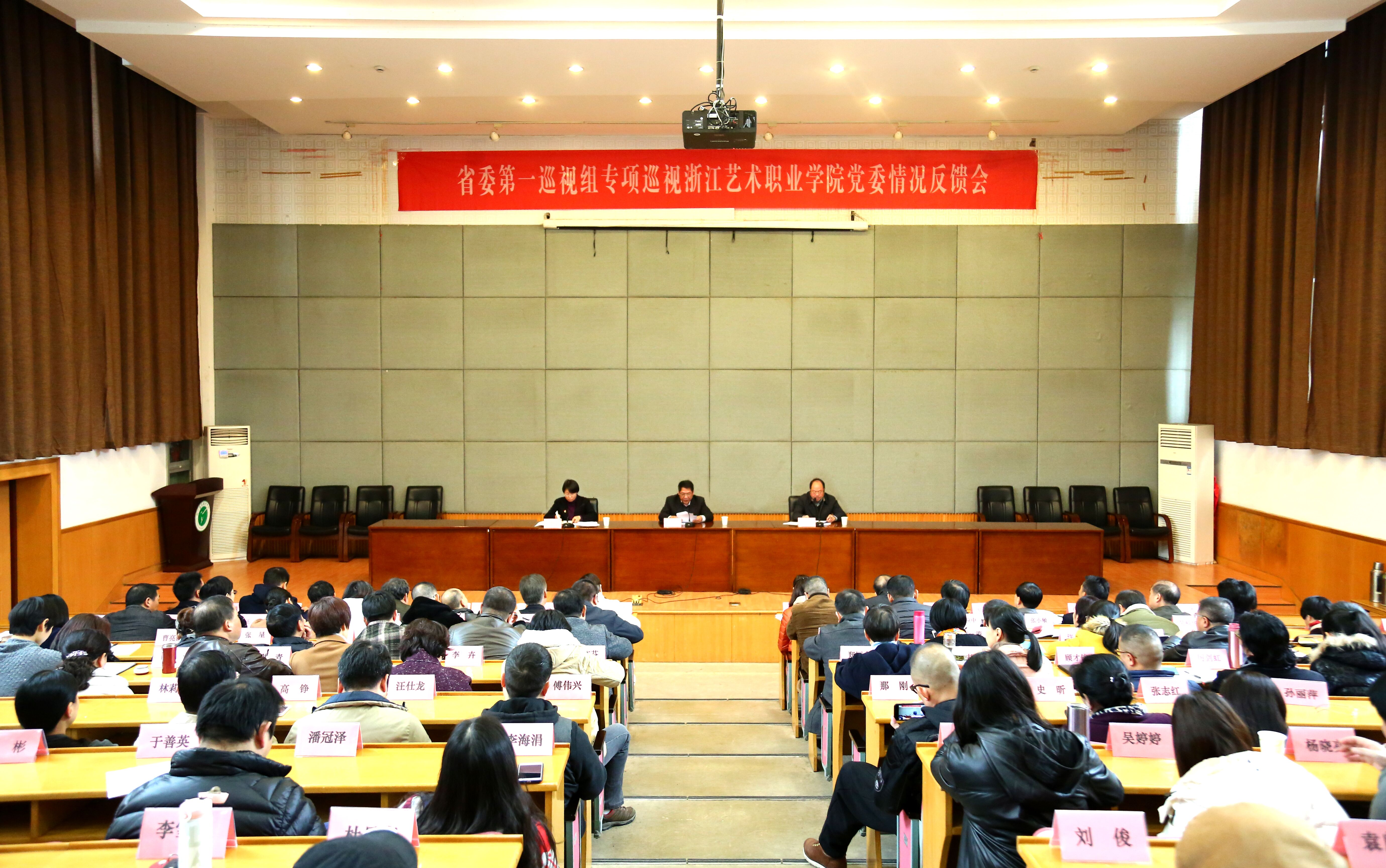 省委第一巡视组有关成员、省委巡视工作领导小组办公室有关部门负责同志、浙江艺术职业学院党委领导班子成员出席会议;省文化厅党组有关负责同志、学院近五年退下来的院级领导、全体中层干部、高级专业技术职务人员代表、教代会主席团成员、学院巡视工作联络组工作人员等列席会议。