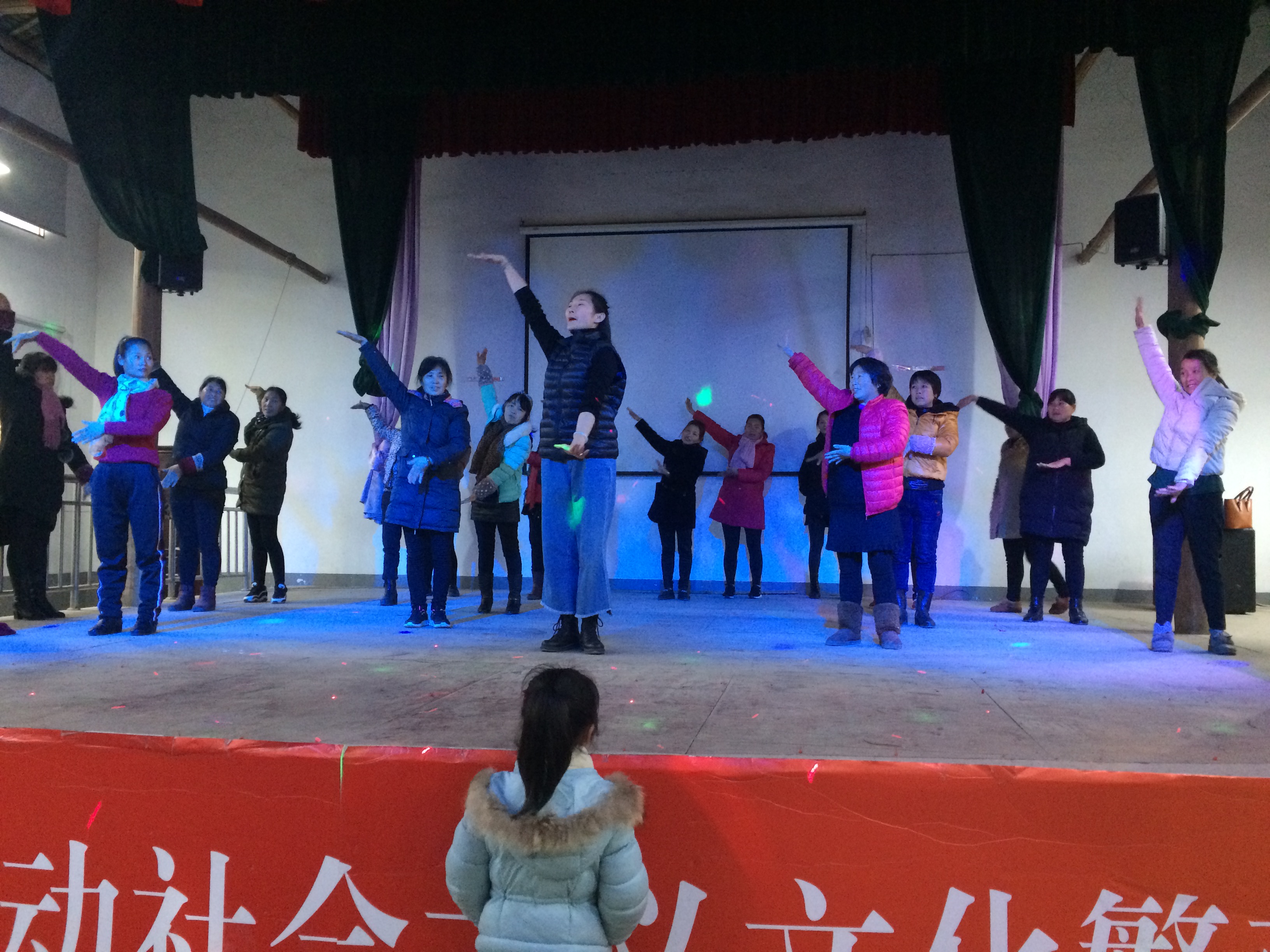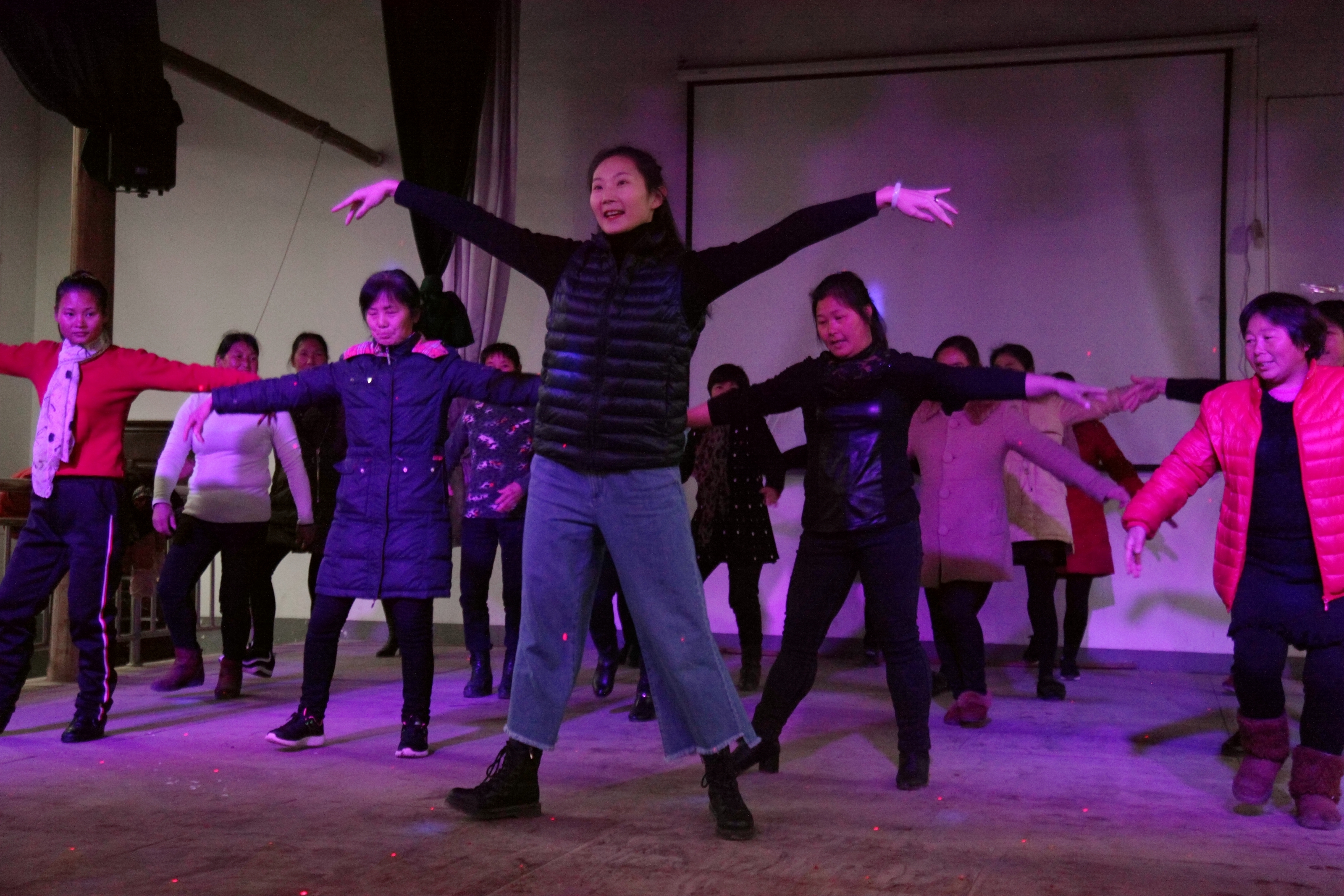 在第二天举行的艺术辅导活动中,浙艺音乐系两位青年教师所作的舞蹈和声乐指导受到了西河村乃至望松街道文艺爱好者的热情欢迎。青年舞蹈教师李小菡带领西河村舞蹈队的村民们在文化礼堂的舞台上跳起了广场舞,将藏族舞融于广场舞中,一招一式教得非常仔细,并不停地手把手纠正村民们的动作。经过一个上午的辅导,村民们对藏族舞有了初步的了解,动作熟练了许多,跳得有模有样,进步很大。青年声乐教师丁倩文为几位热衷于唱歌的村民进行声乐指导,如何发声,如何控制气息,口传身授,不断地示范,让村民们找到了歌唱的力量。