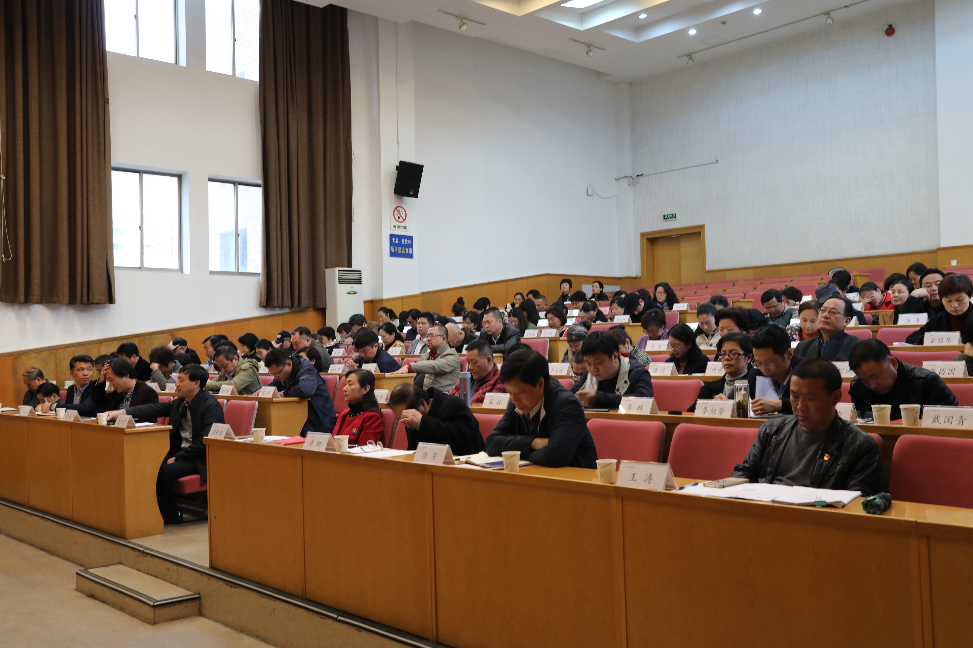 朱海闵代表学校领导班子作2017年度工作总结并作个人述责述德述廉述法报告,其他领导班子成员个人述责述德述廉述法情况以书面形式进行了报告。倪赛英对2017年度学校领导班子和领导人员考核测评工作作了布置和说明。