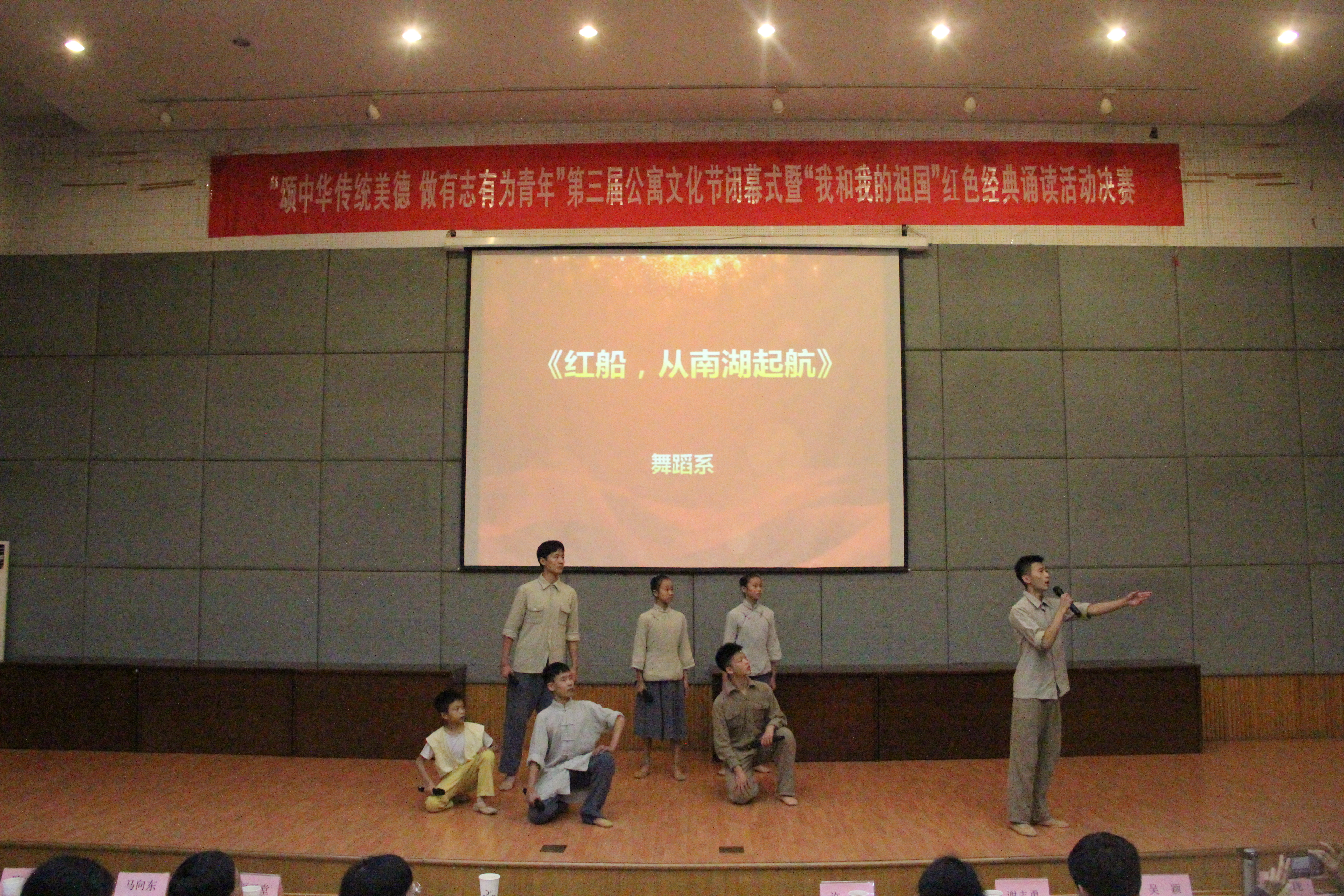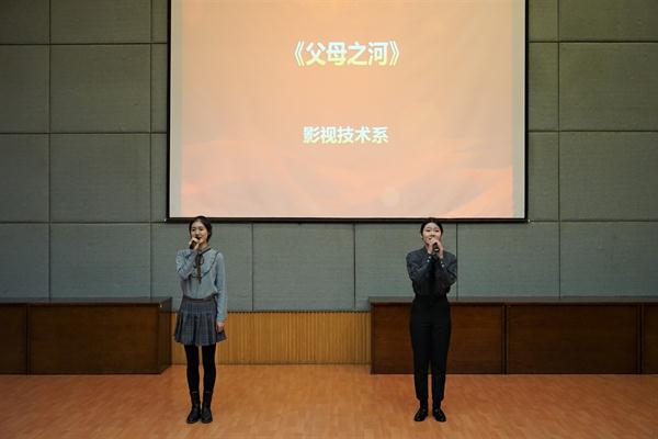 在《光荣啊,中国共青团》嘹亮的歌声中,“我和我的祖国”红色经典诵读活动决赛拉开帷幕。通过前期预选,戏剧系《秋瑾》、音乐系《祖国啊,我亲爱的祖国》、舞蹈系《红船,从南湖启航》、美术系《我是一条古老的河流》、影视技术系《闪耀吧!青春的火光》《父母之河》、文化管理系《美丽中国》《我骄傲,我是中国人》等8组作品进入决赛。同学们用饱含深情、青春激昂的吟唱讴歌党和祖国,礼赞人民英雄。这些作品都是各系师生集体完成,通过团体协作、师生互动,创造精彩、分享美好,现场一次次响起热烈掌声。