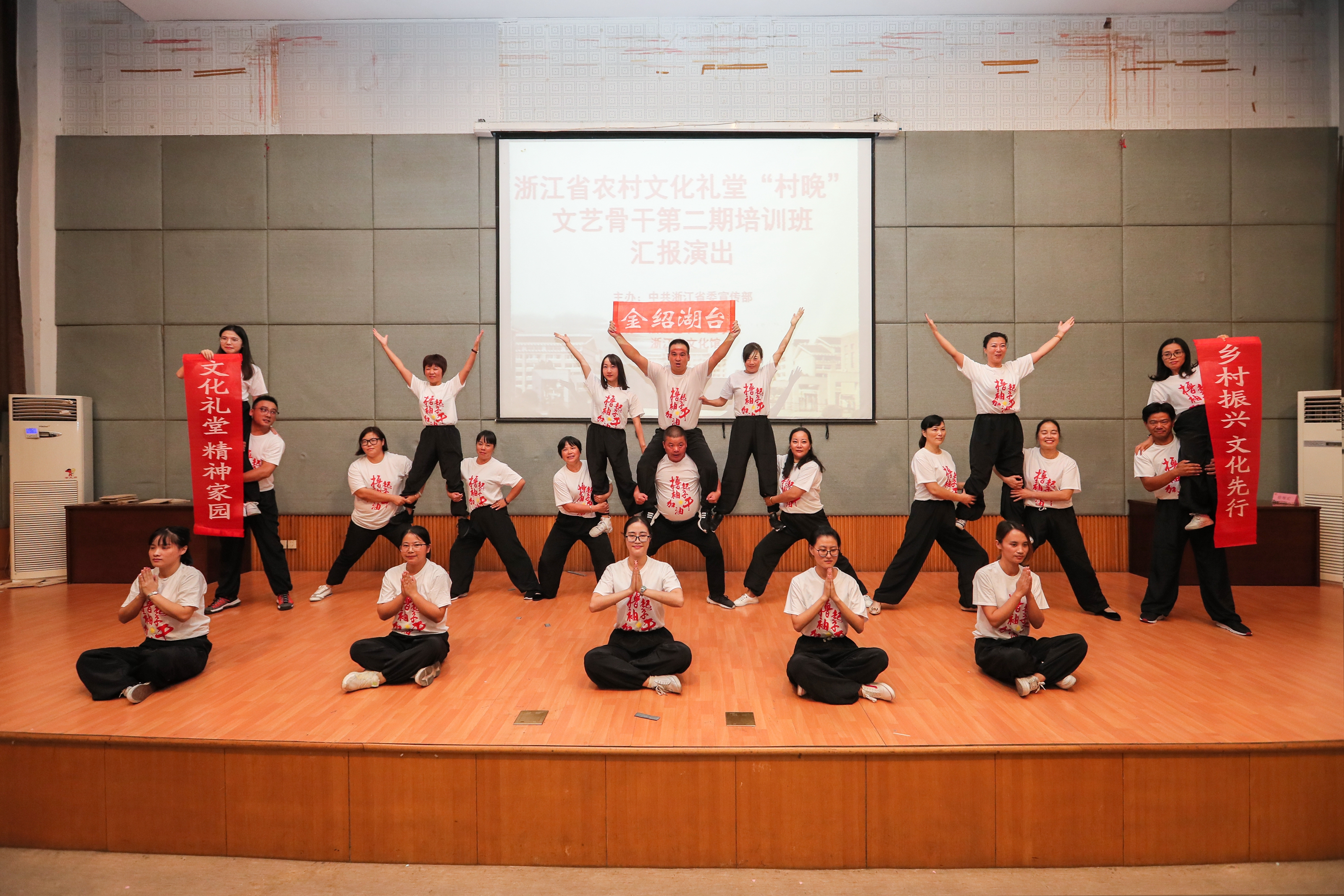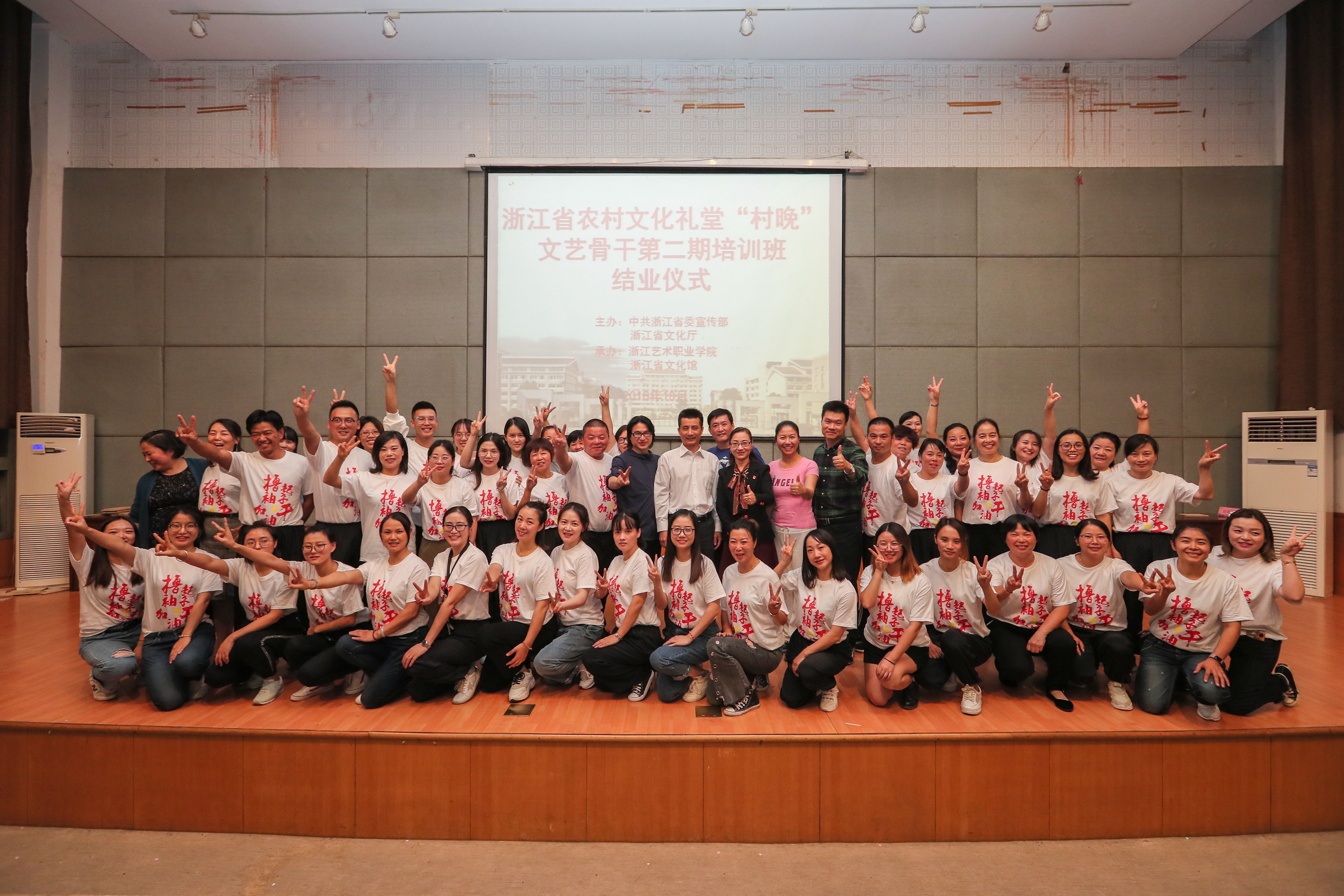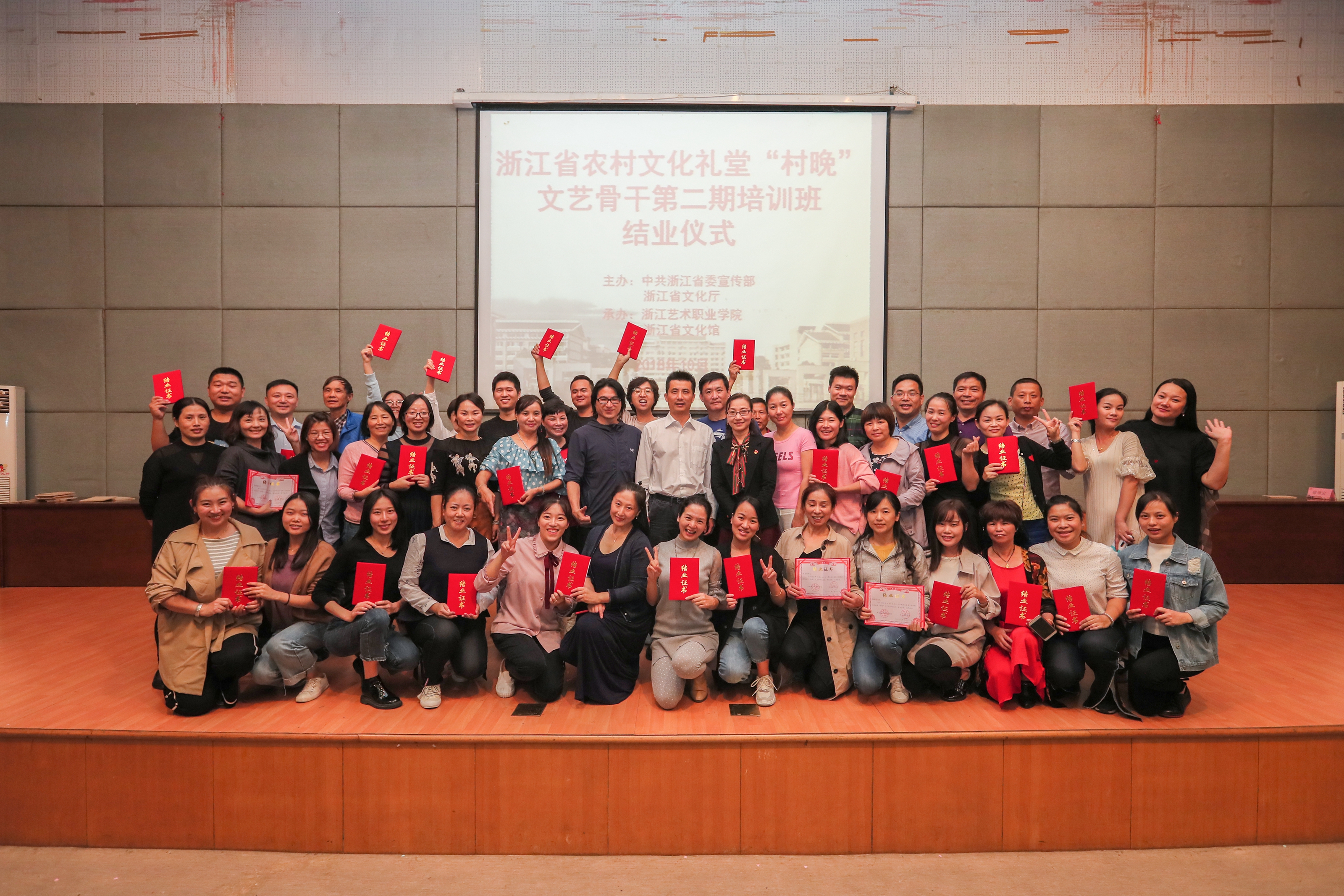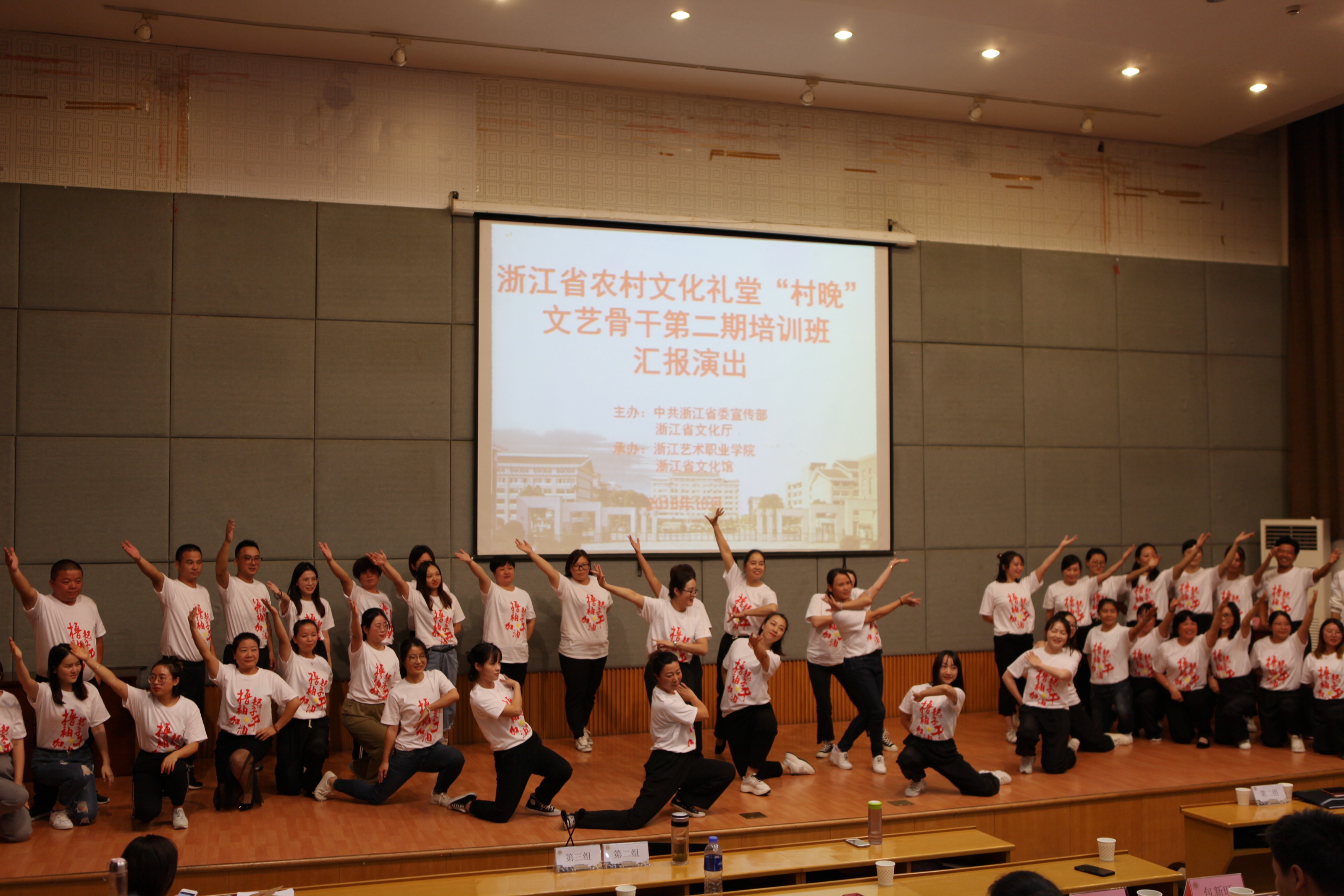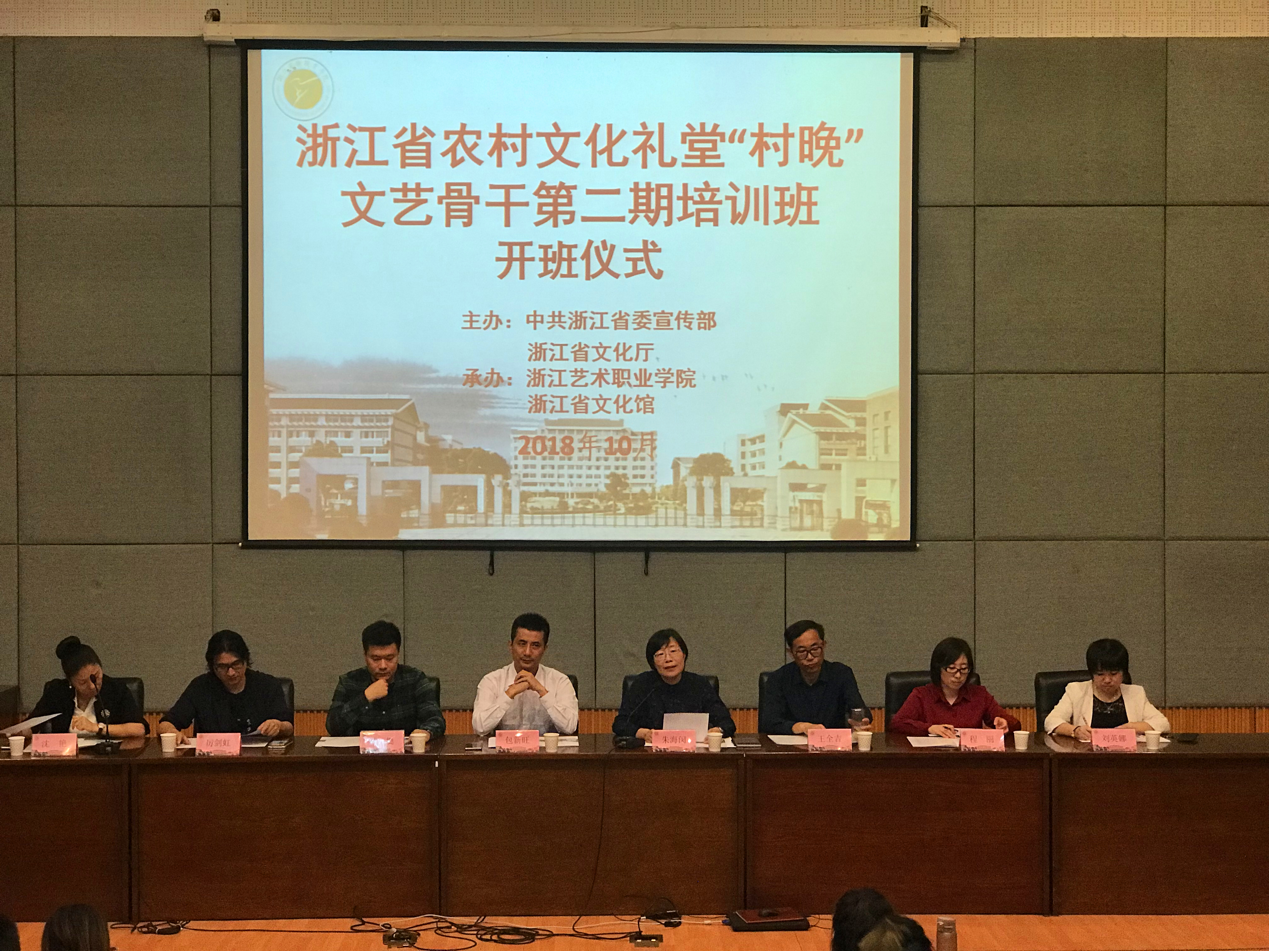 2018年,浙江艺术职业学院承担了农村文化礼堂“村晚”培训、创编、选拔、展演系列活动。省委宣传部提出培训目标和要求,希望全省“村晚”编导应坚持以人民为中心的创作导向,勇于创新创造,抓住“村晚”这一农村文化礼堂内容建设的“牛鼻子”。省文化和旅游厅负责审定培训方案、安排师资。我校和浙江省文化馆在培训形式、教学内容等方面进行了多次对接与沟通。6月,第一期“村晚”文艺骨干培训班开班,来自全省基层的150余名文艺骨干参加了培训,授课方式深受学员欢迎。4个月过去,我省农村文化礼堂从9000多家增至10000家,一个个文化礼堂成为乡村新地标、农民群众的精神家园。村晚村歌演起来,文化礼堂用起来,基层在举办“村晚”时面临的组织策划专业人才缺乏问题越发凸显。为满足基层需要,下半年又增开两期培训班。三期共447人参与培训,成效显著。